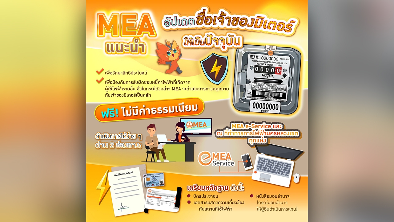 MEA หรือการไฟฟ้านครหลวง แนะนำผู้ใช้ไฟฟ้าที่เป็นเจ้าของเครื่องวัดหน่วยไฟฟ้า หากมีการเปลี่ยนเจ้าของสถานที่ ไม่ว่าจะเป็นการซื้อขาย โอนกรรมสิทธิ์ หรือการปล่อยเช่า ควรดำเนินการ "เปลี่ยนชื่อเจ้าของเครื่องวัดฯ" ให้เป็นชื่อผู้อยู่อาศัยหรือผู้เช่าคนปัจจุบัน เพื่อรักษาสิทธิประโยชน์ต่าง ๆ ของท่าน เช่น MEA Point