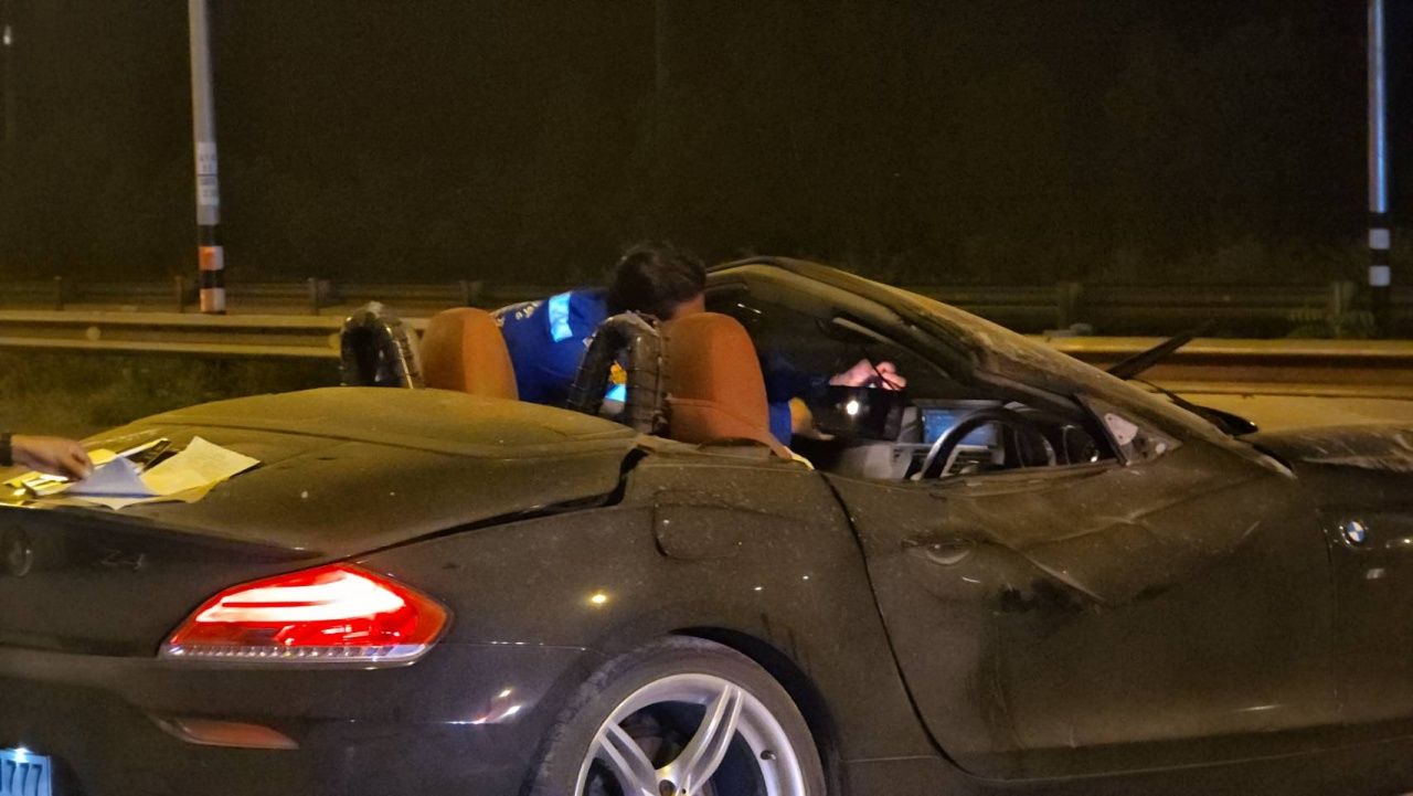 ที่เกิดเหตุพบรถเก๋งสปอร์ต BMW รุ่น Z4 สีดำ ทะเบียน กน 1777 ตรัง จอดขวางอยู่กลางถนน ในสภาพตัวรถยุบและมีรอยครูดจากการพลิกคว่ำ และข้างรถมีร่างคนขับกระเด็นหลุดออกมาจากรถเสียชีวิตคาที่ ทราบชื่อ นายธีระศักดิ์ พรหมมา อายุ 55 ปี พบนามบัตรเป็นฝ่ายเทคนิคของบริษัทใหญ่แห่งหนึ่งที่ทำเกี่ยวกับระบบโทรคมนาคม