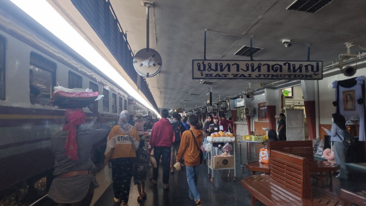 บรรยากาศที่สถานีรถไฟชุมทางหาดใหญ่ คึกคัก รถไฟทั้งขบวนท้องถิ่นและกรุงเทพฯแน่น ตั๋วชั้น 1 ถูกจองเต็มยาวไปจนถึงวันที่ 28 เม.ย. “สายใต้” เสริมขบวนรถพิเศษ 983-984 (กรุงเทพอภิวัฒน์-ยะลา) ถูกจองเต็ม 400 ที่นั่งภายในเวลาแค่ 15 นาที