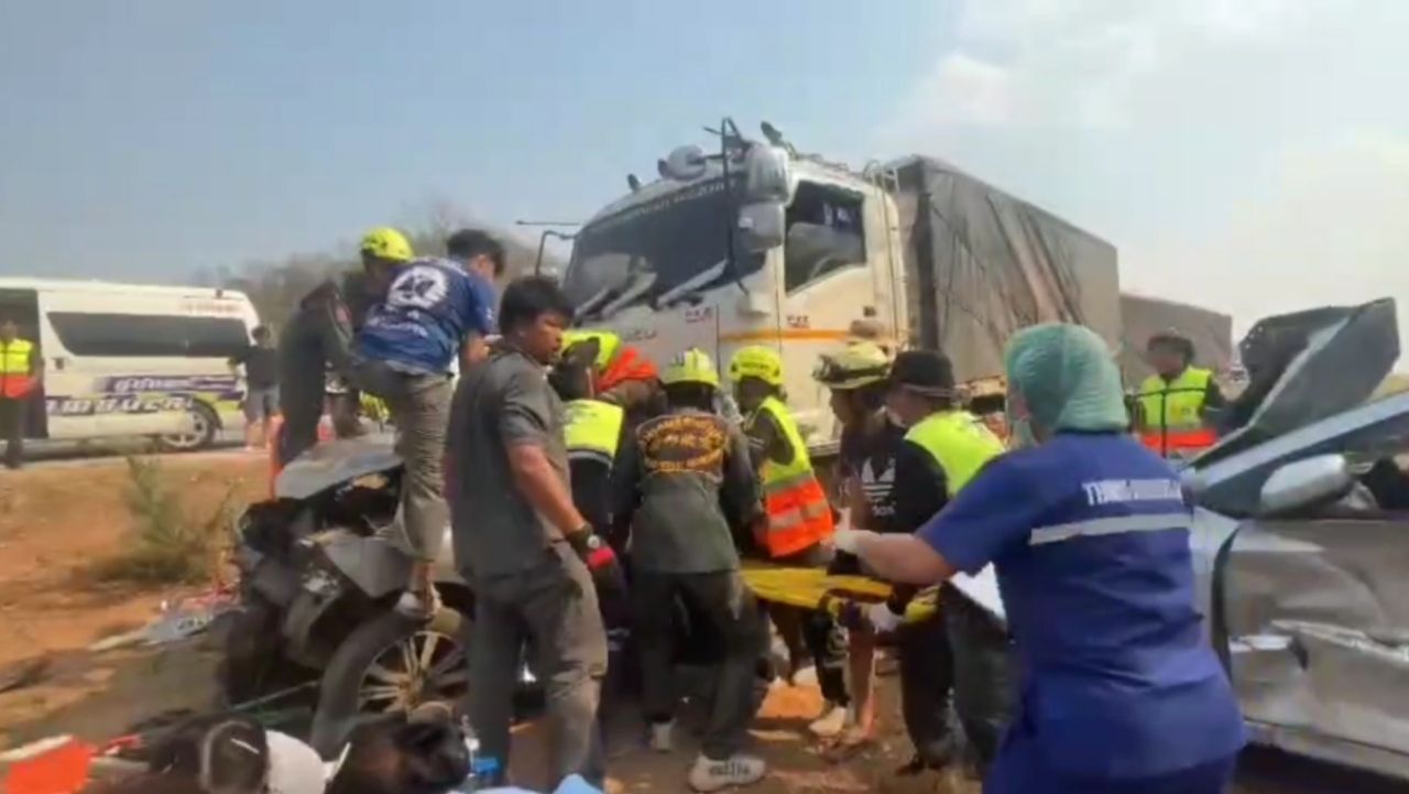 เมื่อเวลา 14.45 น. วันที่ 11 เม.ย. 69 ร.ต.ท.วราเทพ ศรีน้อย รอง สว.(สอบสวน) สภ.เถิน อ.เถิน จ.ลำปาง รับแจ้งเหตุอุบัติเหตุหมู่มีผู้เสียชีวิตและบาดเจ็บหลายรายบนถนนพหลโยธินตาก-ลำปาง ขาขึ้น บริเวณตรงข้ามทางเข้าอุทยานแห่งชาติแม่วะ อำเภอเถิน จังหวัดลำปาง จึงรุดไปที่เกิดเหตุพร้อมด้วยหน่วยกู้ภัยลำปางและกู้ภัยใกล้เคียง