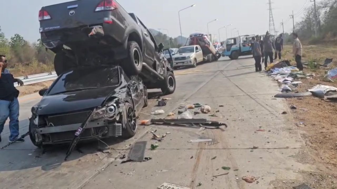 รถพ่วง 18 ล้อเบรกไม่อยู่ พุ่งชนยับ 7 คัน บนถนนพหลโยธินตาก-ลำปาง เสียชีวิตคาที่ 2 ศพ เจ็บ 8 ราย เด็กหญิง 3 ขวบรอดหวุดหวิด