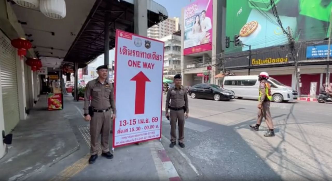 เมื่อเวลา 11.00 น. วันที่ 13 เมษายน 2569 ผู้สื่อข่าวรายงานบรรยากาศเล่นน้ำสงกรานต์ในพื้นที่จังหวัดขอนแก่น โดยทางพ.ต.อ.ยศวัจน์ แก้วสืบธัญนิจ ผกก.สภ.เมืองขอนแก่น พร้อมด้วย พ.ต.ท.สุพรชัย วงศ์ผาคุณ รอง ผกก.(จร.) สภ.เมืองขอนแก่น นำกำลังเจ้าหน้าที่ตำรวจจราจรเร่งดำเนินการติดตั้งป้ายประชาสัมพันธ์ วางแผงกั้น และกรวยยาง เพื่อกำหนดเส้นทางการเดินรถแบบทางเดียว (One-way) ภายในเขตพื้นที่เล่นน้ำชั้นในของเมืองขอนแก่น เพื่อเตรียมพร้อมรับนักท่องเที่ยวทั้งชาวไทยและชาวต่างชาติที่จะเดินทางมาร่วมสืบสานประเพณีสงกรานต์ ณ ถนนข้าวเหนียว ในวันแรก