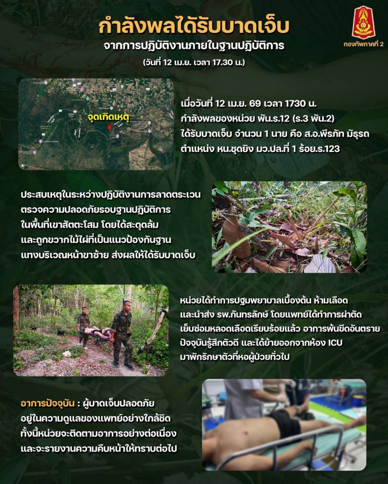 ล่าสุด วันนี้ (13 เม.ย. 69) แฟนเพจ กองทัพภาคที่ 2 ได้รายงานเหตุการณ์กำลังพลได้รับบาดเจ็บจากการปฏิบัติงานในพื้นที่เขาสัตตะโสม อ.กันทรลักษ์ จ.ศรีสะเกษ ว่า เมื่อวันที่ 12 เม.ย. 69 เวลา 1730 น. กำลังพลของหน่วย พัน.ร.12 (ร.3 พัน.2) จำนวน 1 นาย ได้แก่ ส.อ. พีรภัท มัธุรถ ตำแหน่ง หน.ชุดยิง มว.ปล.ที่ 1 ร้อย.ร.123