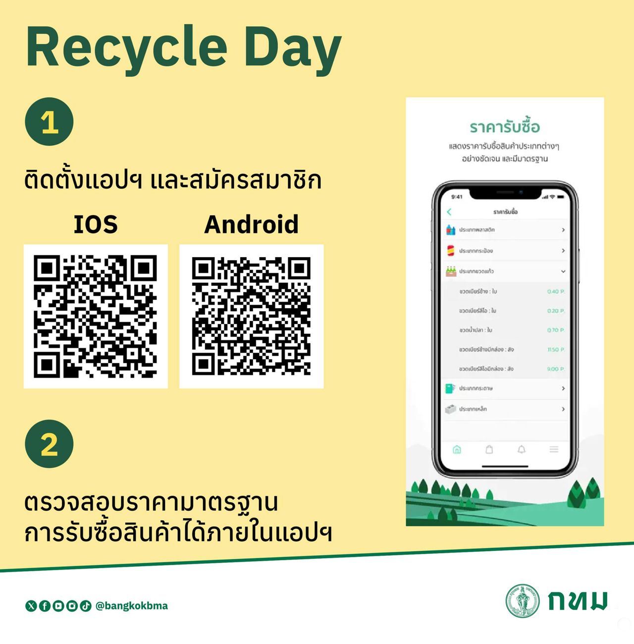 1. ติดตั้งแอปพลิเคชันและสมัครสมาชิก : เริ่มต้นง่าย ๆ เพียงดาวน์โหลดแอปพลิเคชัน Recycle Day บนมือถือของคุณ iOS: http://t.ly/TEHLV และ Android: t.ly/kK0SW จากนั้นสมัครสมาชิกเพื่อเข้าใช้งานระบบ