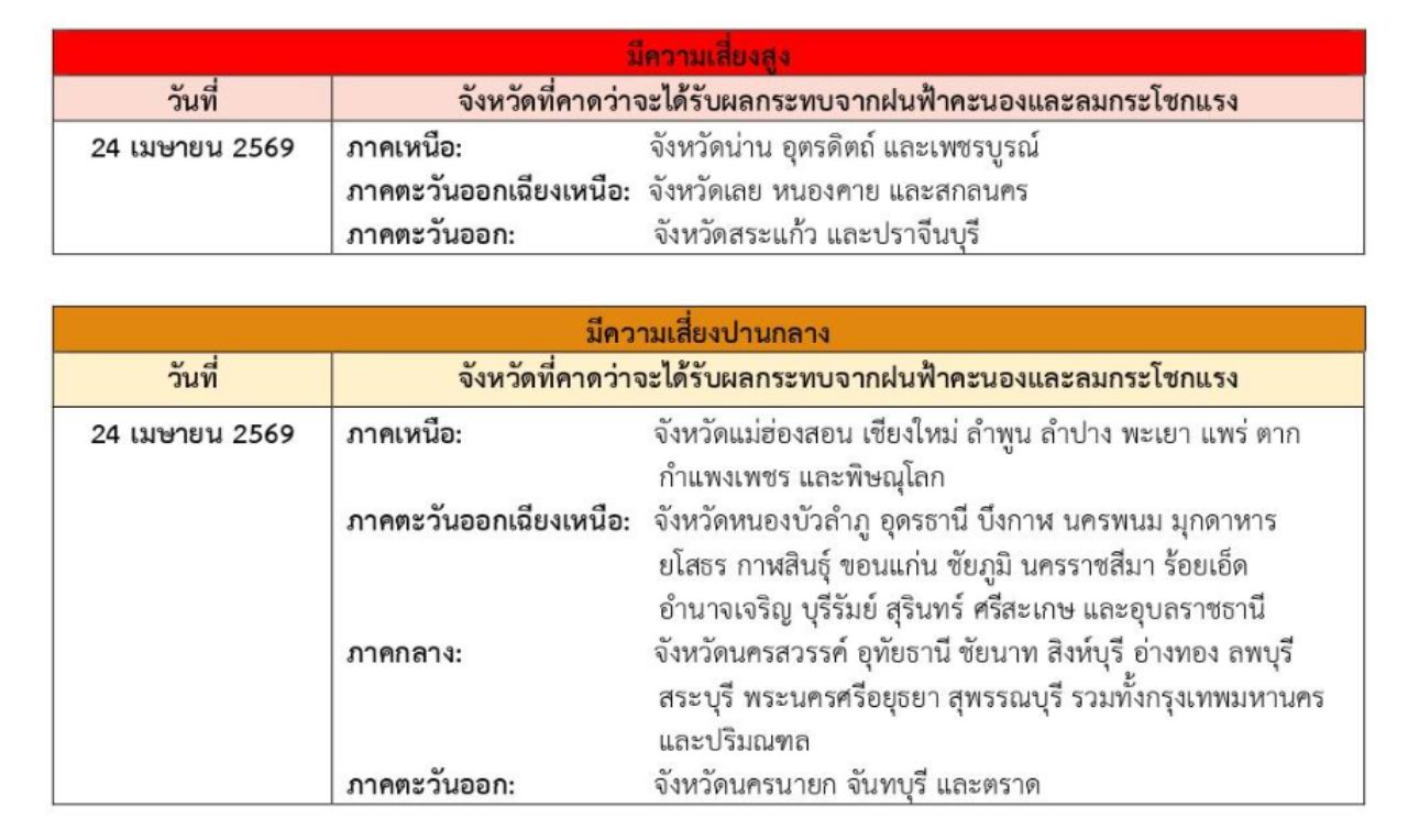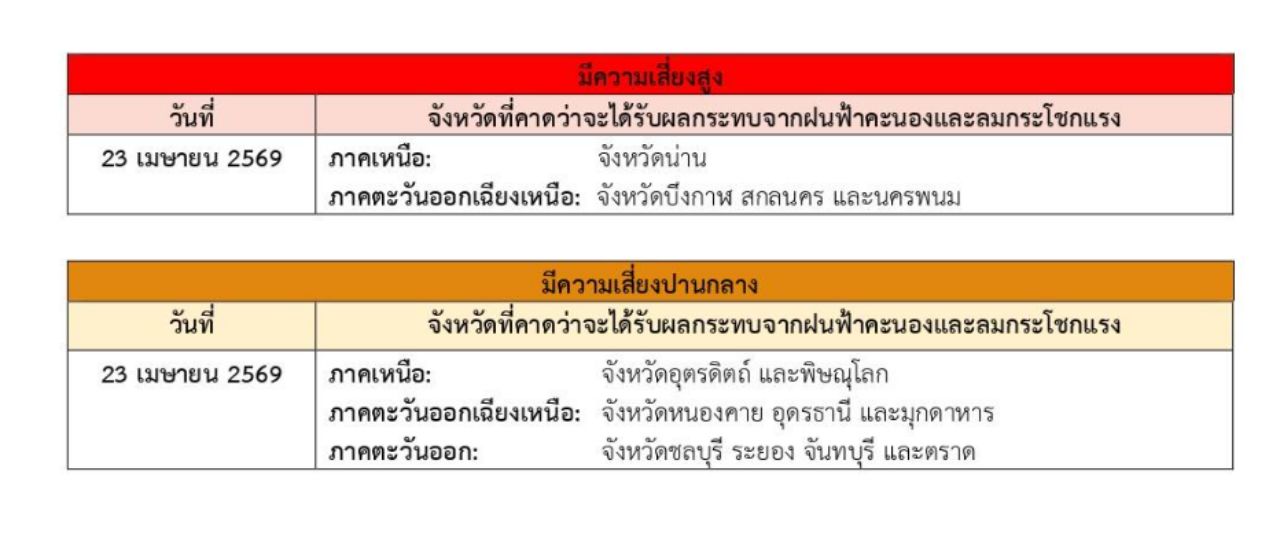 วันที่ 21 เมษายน 2569 เว็บไซต์กรมอุตุนิยมวิทยา ประกาศเรื่อง "พายุฤดูร้อนบริเวณประเทศไทยตอนบน (มีผลกระทบตั้งแต่วันที่ 23–25 เมษายน 2569) ฉบับที่ 1 (33/2569)" โดยระบุว่า ในช่วงวันที่ 23–25 เมษายน 2569 ประเทศไทยตอนบนจะมีพายุฤดูร้อนเกิดขึ้น โดยมีลักษณะของพายุฝนฟ้าคะนอง ลมกระโชกแรง ฟ้าผ่า และลูกเห็บตกบางพื้นที่ โดยจะเริ่มจากภาคเหนือ ภาคตะวันออกเฉียงเหนือ และภาคตะวันออกก่อน