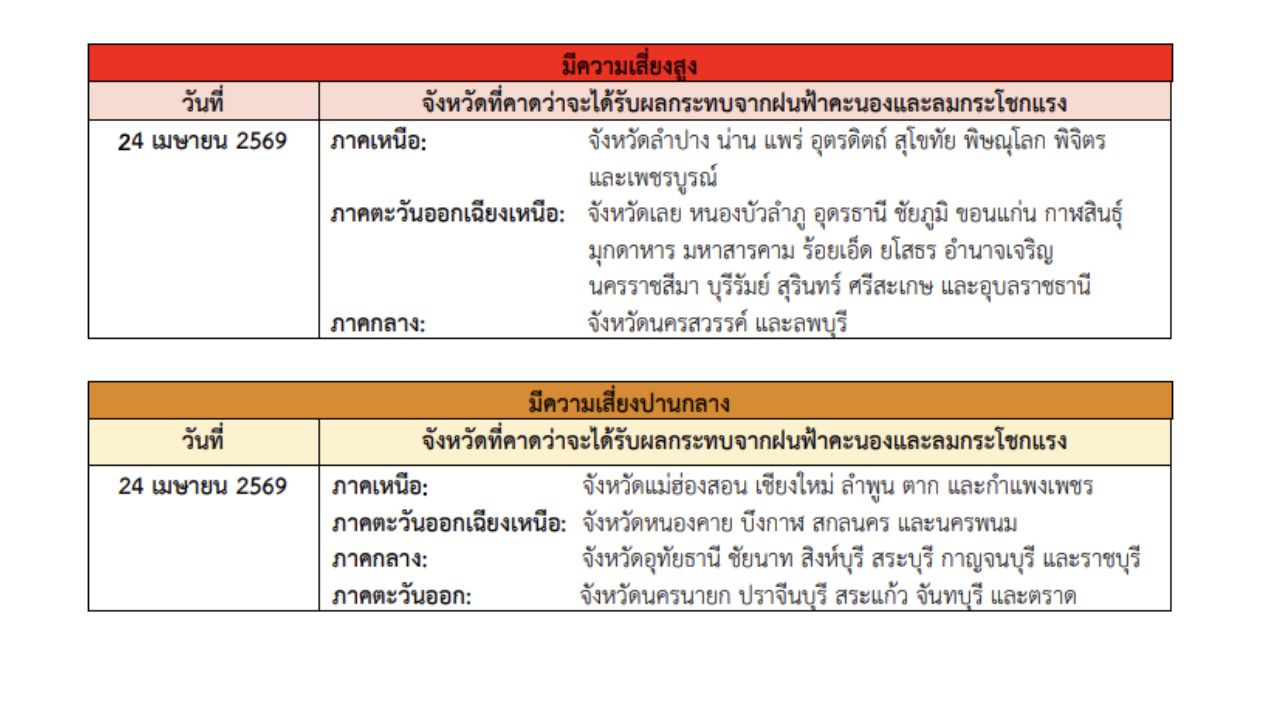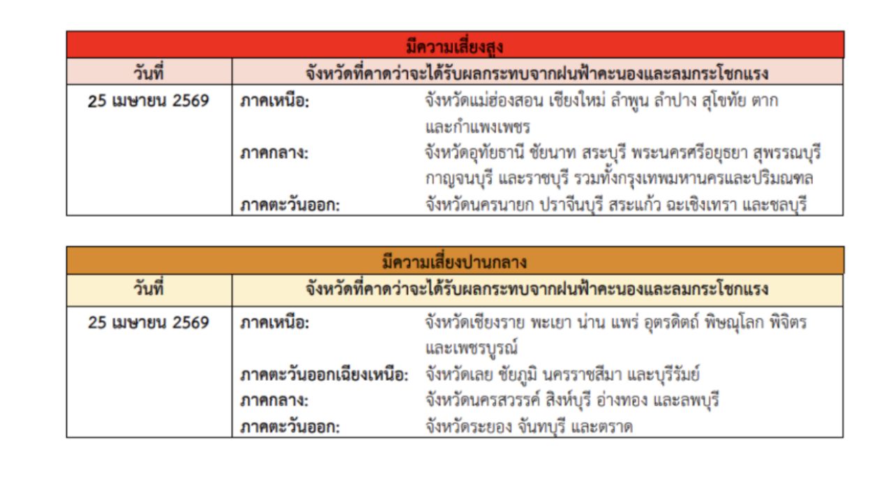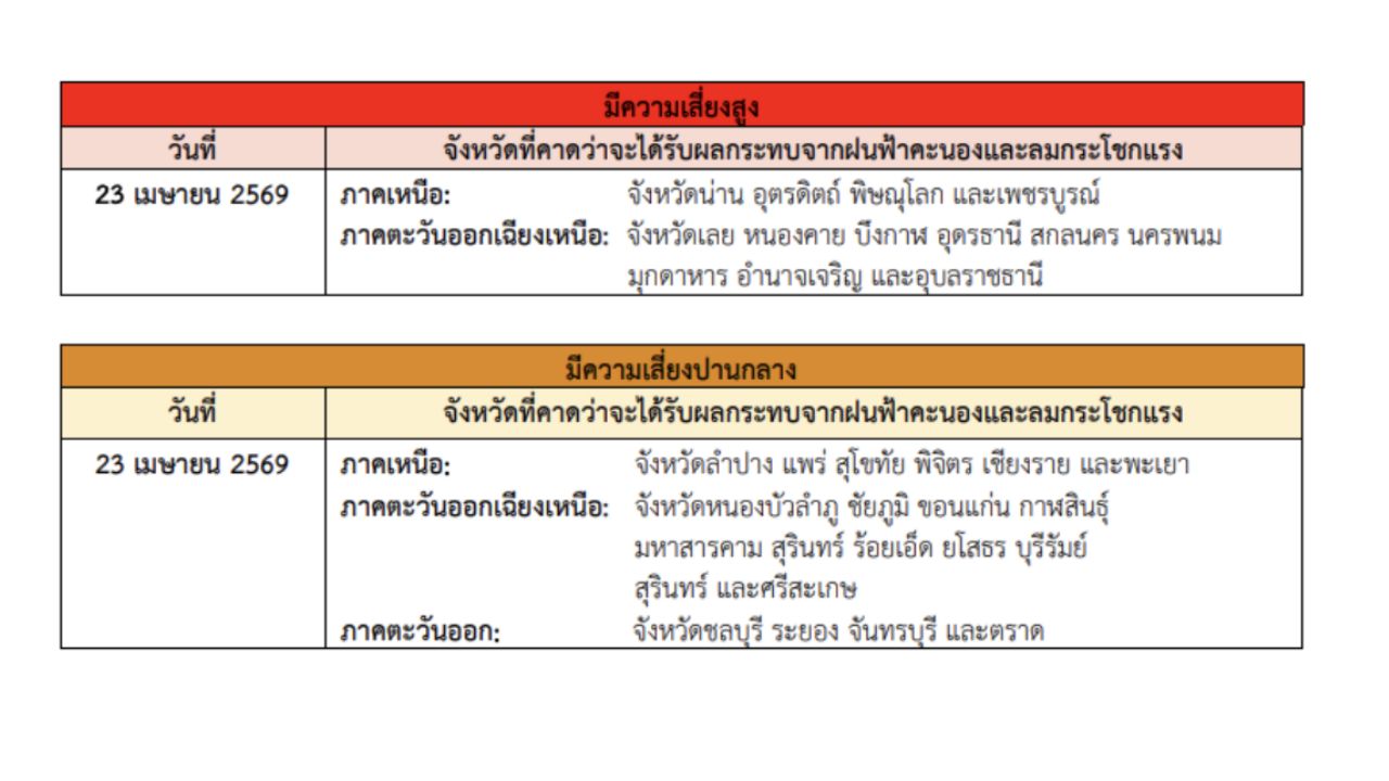 โดยระบุว่า ในช่วงวันที่ 23–25 เม.ย. 69 ประเทศไทยตอนบนจะมีพายุฤดูร้อนเกิดขึ้น โดยมีลักษณะของพายุฝนฟ้าคะนอง ลมกระโชกแรง ลูกเห็บตก และฝนตกหนักบางแห่ง รวมถึงอาจมีฟ้าผ่าเกิดขึ้นได้บางพื้นที่ โดยจะเริ่มจากภาคเหนือ และภาคตะวันออกเฉียงเหนือก่อน ส่วนภาคกลาง รวมทั้งกรุงเทพมหานครและปริมณฑล และภาคตะวันออก จะได้รับผลกระทบในระยะถัดไป เนื่องจากบริเวณความกดอากาศสูงหรือมวลอากาศเย็นจากประเทศจีนจะแผ่ลงมาปกคลุมภาคตะวันออกเฉียงเหนือและทะเลจีนใต้ ในขณะที่ประเทศไทยตอนบนมีอากาศร้อนถึงร้อนจัดโดยทั่วไป