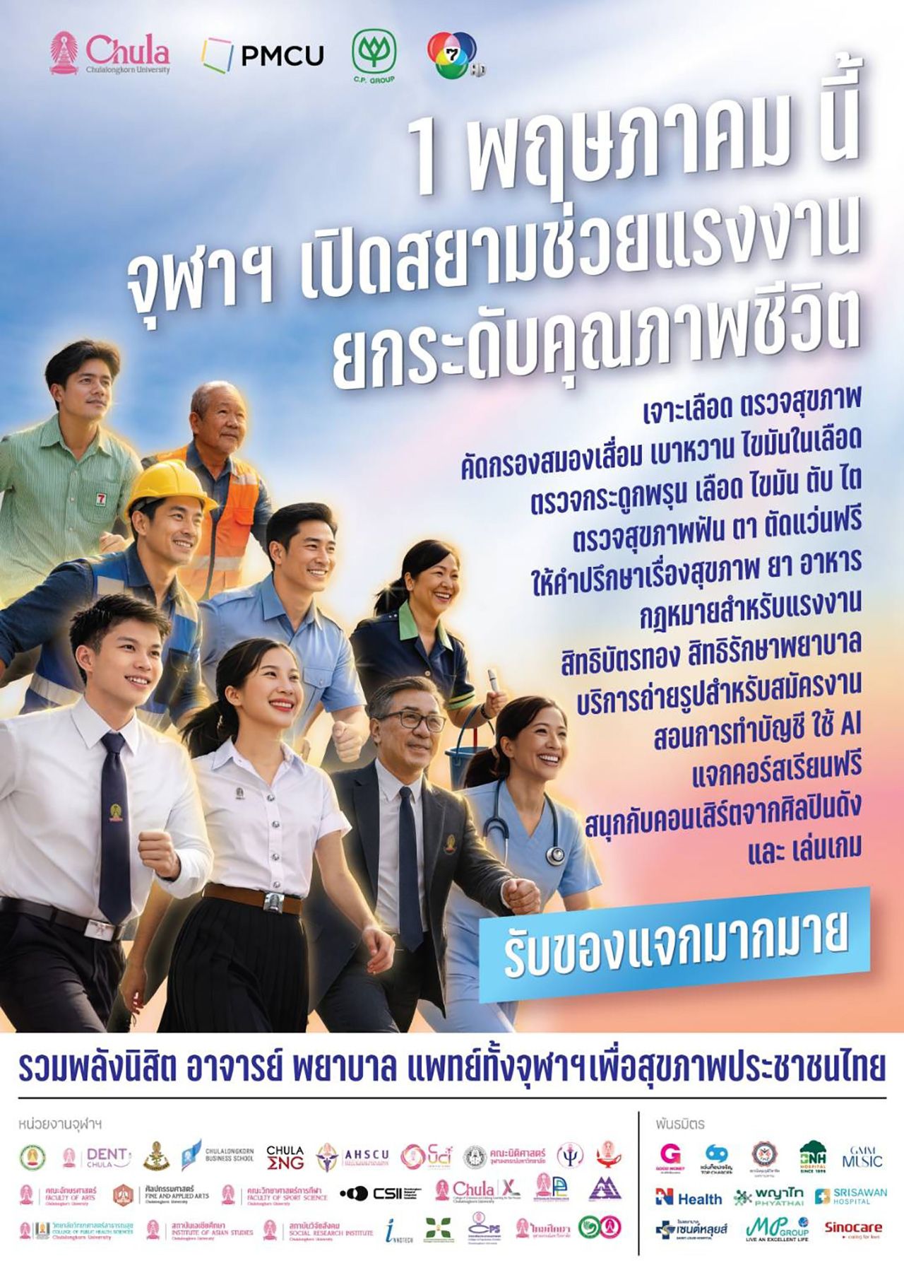จุฬาฯ จึงเดินหน้าจัดงานแรงงานต่อเนื่องเป็นปีที่ 2 ชวนแรงงานไทย ปักหมุดสยามสแควร์ ตรวจสุขภาพ และรับบริการด้านต่างๆจากนิสิต คณาจารย์ พยาบาล และแพทย์จากกว่า 20 คณะและหน่วยงานในจุฬาฯ ฟรี 1 พฤษภาคม 2569 ภายใต้การดำเนินงานของ PMCU (สำนักงานจัดการทรัพย์สินจุฬาลงกรณ์มหาวิทยาลัย) กับงาน จุฬาฯห่วงใย แรงงานไทยแข็งแรง โดยในการจัดงานปีที่แล้ว มีแรงงานเข้าร่วมใช้บริการกว่า 2,000 คน และมูลค่าการให้บริการตรวจสุขภาพฟรีรวมกว่า 2.5 ล้านบาท ตอกย้ำบทบาทของจุฬาฯ ในการสร้างพื้นที่ดูแลคุณภาพชีวิตแรงงานไทยอย่างต่อเนื่อง