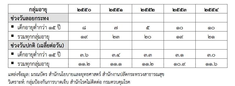ย้อนไปในปี 2550-2554 มีผู้บาดเจ็บในช่วงเทศกาลลอยกระทง จากการถูกเปลว สะเก็ด ดอกไม้ไฟหรือพลุ รวม 2,979 ราย เฉลี่ยปีละ 596 ราย เสียชีวิต 8 ราย โดยพบผู้บาดเจ็บจากพลุ ร้อยละ 22 หรือ ประมาณ 166 ราย ที่น่าสนใจ พบว่าการบาดเจ็บมีความรุนแรงมากขึ้น โดยมีผู้เสียชีวิตถึง 4 ราย อายุที่พบต่ำสุด 2 ปี สูงสุด 90 ปี ร้อยละ 16 มีอาการเมาร่วมด้วย