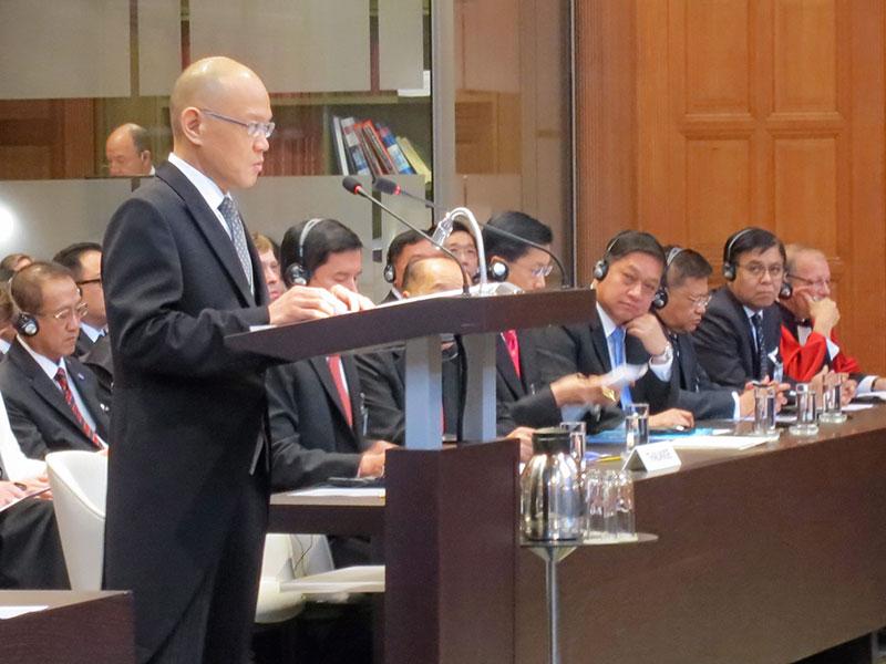 วันที่ 15 เม.ย.ศาลยุติธรรมระหว่างประเทศ หรือศาลโลก กรุงเฮก เนเธอร์แลนด์ พิจารณาคดีที่กัมพูชายื่นขอให้ตีความคำพิพากษาปี 2505 กรณีพื้นที่รอบปราสาทพระวิหาร เป็นของกัมพูชาหรือไทย โดยศาลให้กัมพูชาเป็นฝ่ายแถลงด้วยวาจาก่อน ส่วนไทยได้แถลงวันที่ 17 เม.ย. มีนายวีรชัย พลาศรัย เอกอัครราชทูตไทย ณ กรุงเฮก ในฐานะหัวหน้าคณะต่อสู้ฝ่ายไทย ขึ้นแถลงพร้อมด้วยทีมทนายความ ย้ำว่าไทยได้ปฏิบัติตามคำพิพากษาศาลโลกมาตลอดในขณะที่กัมพูชาทำให้ศาลโลกเข้าใจผิดในข้อเท็จจริง ทั้งยังกล่าวอ้างพื้นที่ทับซ้อน 4.6 ตาราง กิโลเมตร เป็นของกัมพูชาอีกด้วย ก่อนที่จะมีการแถลง ปิดคดีด้วยวาจาในวันที่ 19 เม.ย. ต่อมาศาลโลกนัดฟังคำตัดสินในวันที่ 11 พ.ย.ปีเดียวกัน โดยศาลโลกรับมีอำนาจตีความเพิ่มเติมตามคำพิพากษาปี 2505 ตามที่กัมพูชาร้องขอ แต่ไม่รับฟังข้อเรียกร้องของกัมพูชาเหนือพื้นที่ 4.6 ตร.กม. ชี้ว่าพื้นที่รอบปราสาทอยู่ในอธิปไตยของกัมพูชาเช่นเดียวกับปราสาทพระวิหาร ครอบคลุมทั้งชะง่อนผา แต่ไม่ถึงภูมะเขือ และย้ำให้ 2 ประเทศดูแลมรดกโลกร่วมกัน.