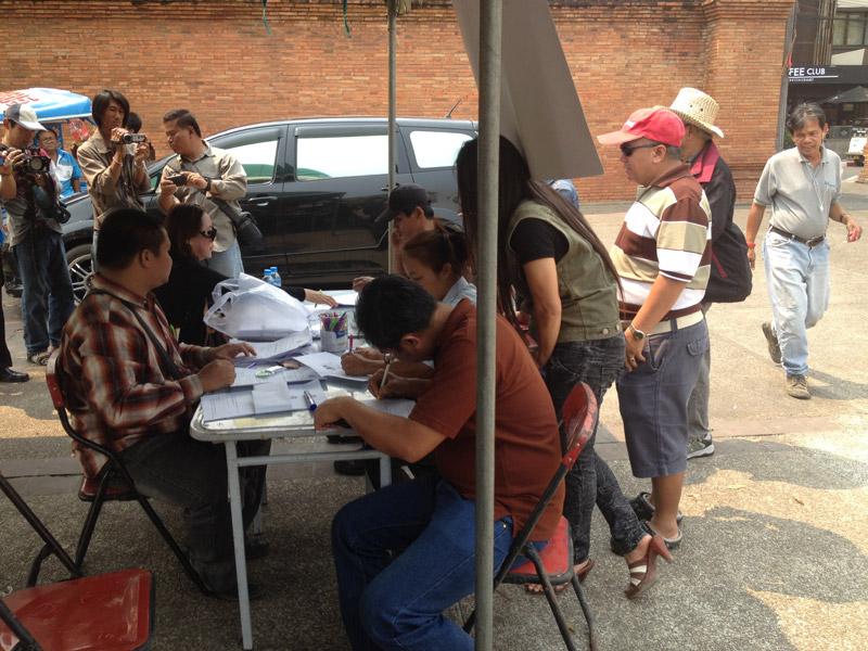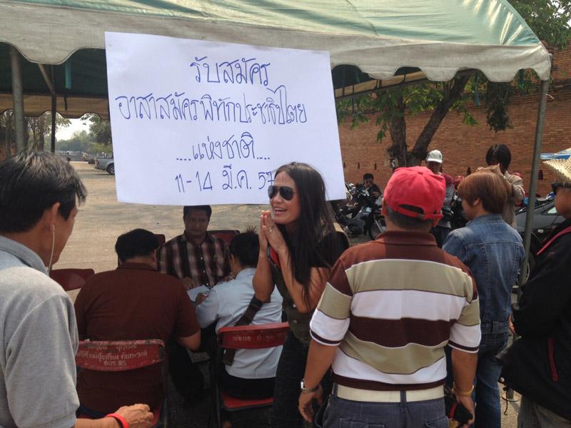 ผู้สื่อข่าวรายงานว่า ที่ข่วงประตูท่าแพ จ.เชียงใหม่ นายอภิชาติ อินสอน หรือ “ดีเจอ้วน” แกนนำกลุ่มคนเสื้อแดงอิสระจังหวัดเชียงใหม่ ได้ตั้งเต็นท์ตั้งโต๊ะเปิดรับสมัครอาสาสมัครพิทักษ์ประชาธิปไตยแห่งชาติ ขึ้นในระหว่างวันที่ 11-14 มี.ค.57 และเผยว่า การรับสมัครวันนี้ เพื่อหาอาหาสมัครชาย-หญิงที่มีร่างกายแข็งแรง เพื่อเข้าไปเป็นอาสาสมัครพิทักษ์ประชาธิปไตย เพื่อมาปกป้องระบอบประชาธิปไตย และต่อต้านการทำรัฐประหารทุกรูปแบบ ซึ่งไม่ใช่ทำเฉพาะที่จังหวัดเชียงใหม่เท่านั้น หลายจังหวัดในภาคอีสานก็เปิดรับสมัครแล้วเช่นกัน วันนี้มีคนเสื้อแดงเริ่มทยอยกันมาสมัครทางคณะกรรมการจะนำไปคัดเอาคนที่ ร่างกายแข็งแรงเท่านั้น จังหวัดเชียงใหม่ตั้งเป้าเอาไว้ว่า จะมีคนเสื้อแดงผู้รักประชาธิปไตยมาสมัครไม่ต่ำกว่า 1 พันคน ระหว่างเปิดรับสมัครนั้นมีตำรวจนอกเครื่องแบบ และ จนท.หน่วยงานความมั่นคงมาติดตามดูแลอย่างใกล้ชิด.
