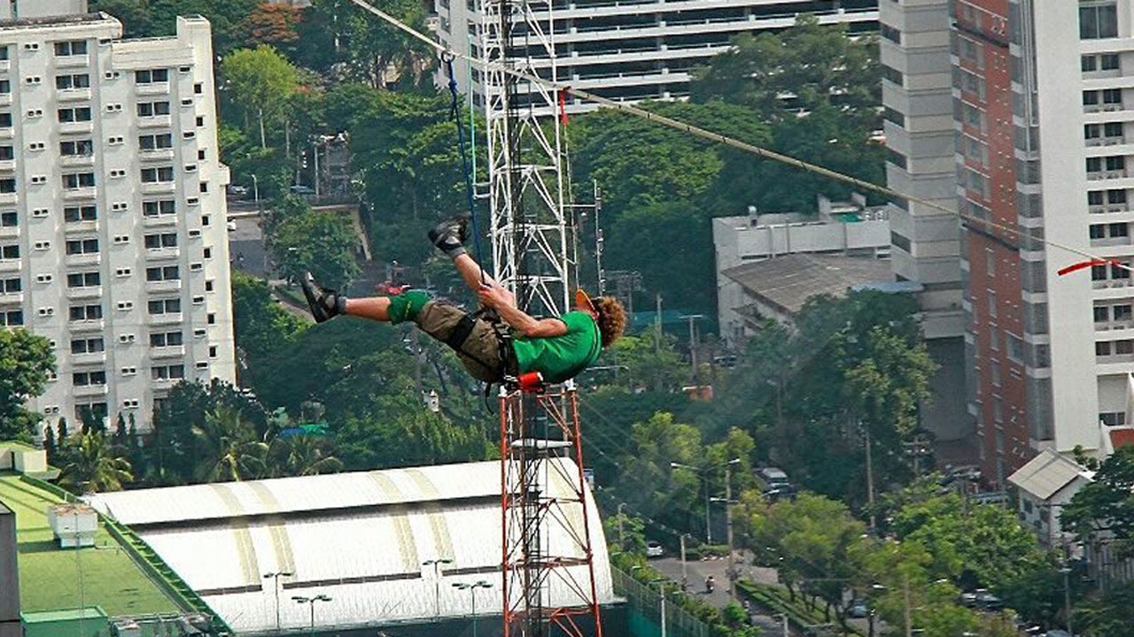 แอนดี ลูอิส แชมป์โลกกีฬาสแลคไลน์ ชาวอเมริกัน เสียจังหวะร่วงจากเส้นเชือกระหว่างเดินไต่เชือกเส้นเดียวที่ผูกระหว่างชั้นดาดฟ้าตึกดิ ออฟฟิศเศส แอท เซ็นทรัลเวิลด์ กับชั้น 55 เรดบาร์ โรงแรมเซ็นทาราแกรนด์ ระยะทาง 169 เมตร แต่ในที่สุดก็ทำสำเร็จและทำลายสถิติโลก.