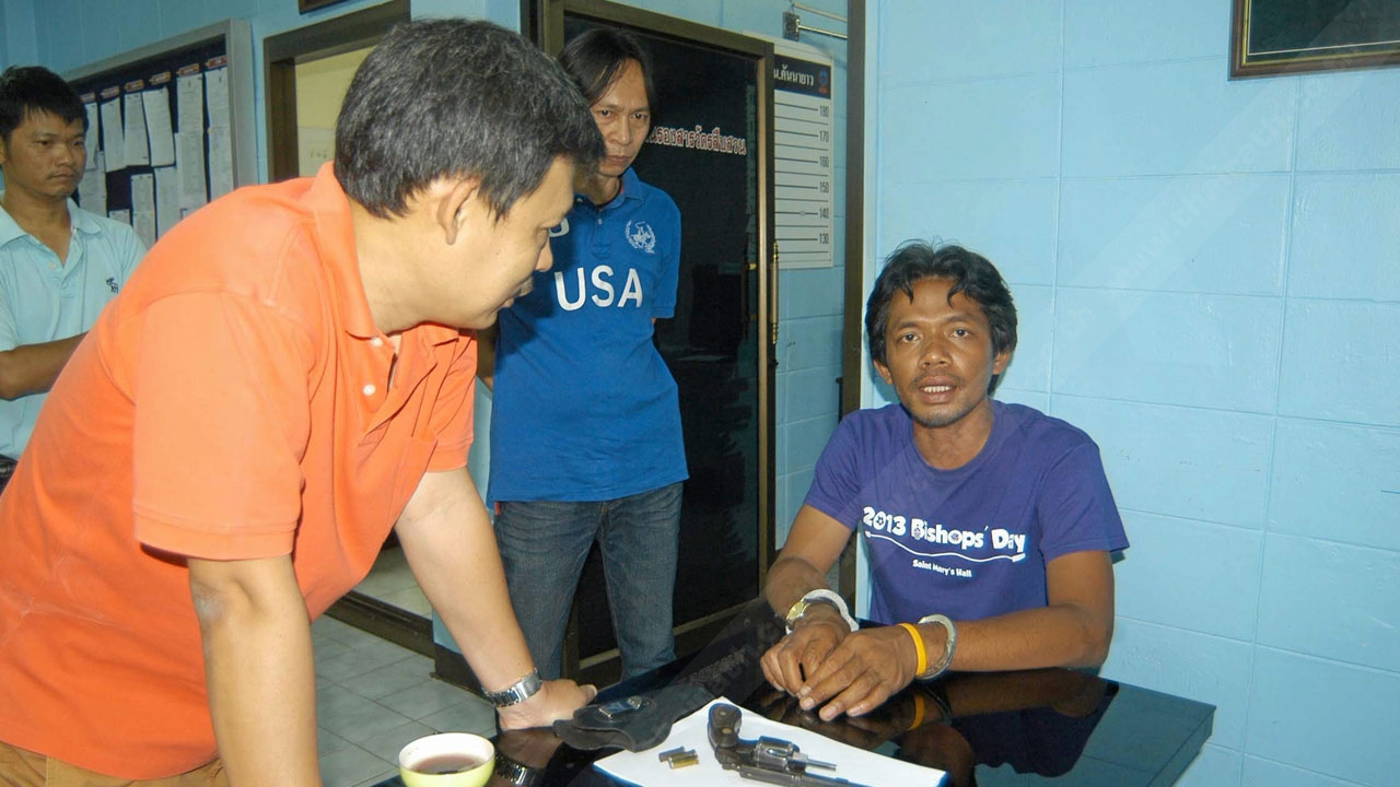 ชุดสืบสวน สน.คันนายาว สอบสวนนายไตรรงค์ จรรยาวงษ์ ลูกจ้างชั่วคราว เขตคลองสามวา พร้อมปืน .38 ของกลาง หลังก่อเหตุยิงนายณรงค์ศักดิ์ มั่นคง ลูกจ้างชั่วคราวเขตเดียวกัน บาดเจ็บสาหัสในสำนักงานเขต เนื่องจากโกรธแค้นที่ถูกถากถางว่ามีอันจะกินเพราะเป็นลูกบุญธรรมของพระครูสังฆรักษ์โสภณ เจ้าอาวาสวัดบึงพระยาสุเรนทร์.
