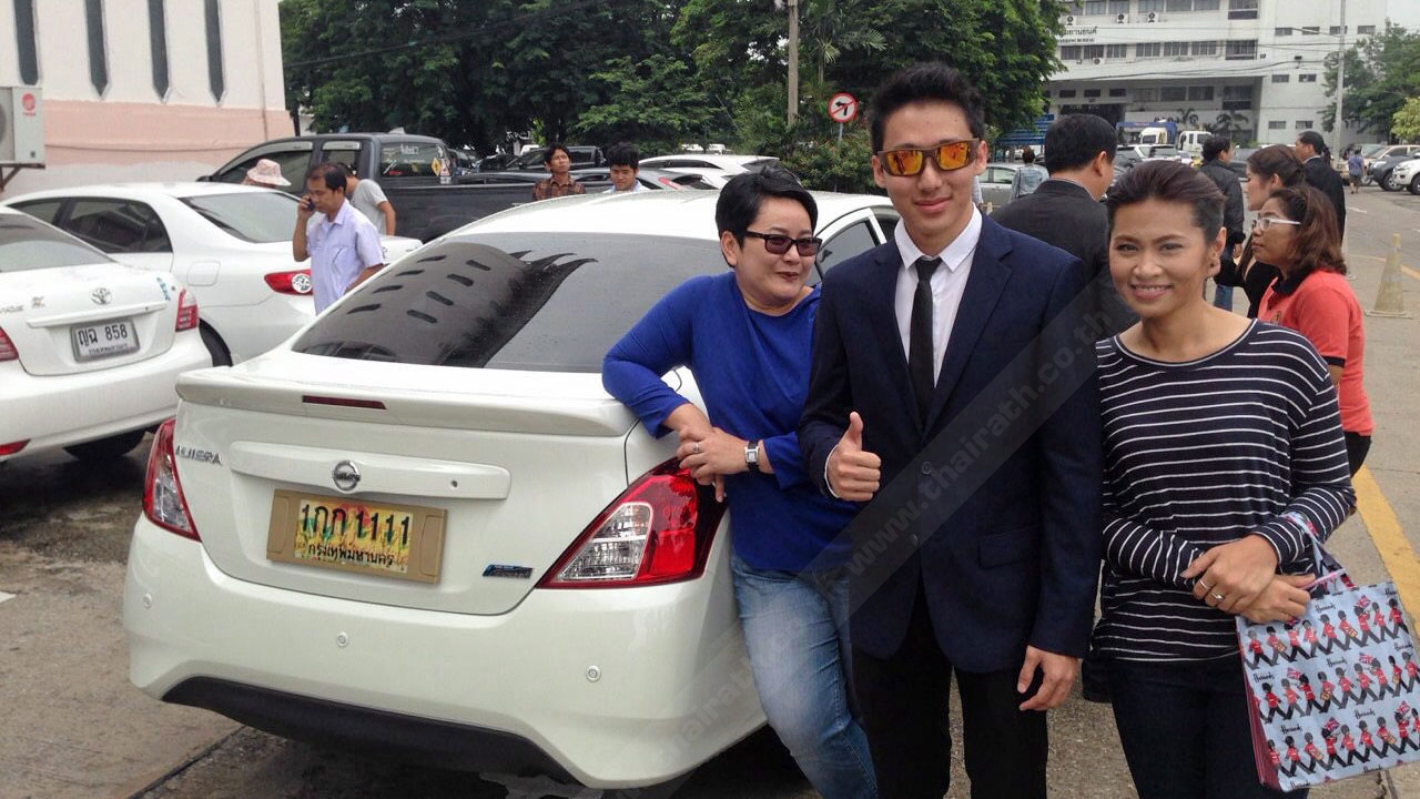 นายธนภัทร ตันติเสเวกุล นศ.ม.เอแบค ทายาทนักธุรกิจจากชลบุรี ถ่ายภาพ คู่กับรถนิสสัน อัลเมร่า ที่ติดป้ายทะเบียนรถเลขสวย 1 กก 1111 ซึ่งประมูลได้ในราคา 25 ล้านบาท สูงสุดนับตั้งแต่กรมการขนส่งทางบกเคยจัดประมูล.