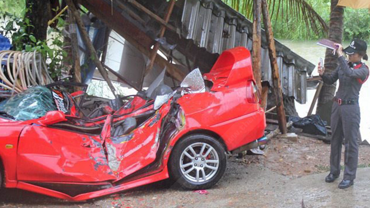 สภาพรถเก๋งจอดหน้าสำนักปฏิบัติธรรมถ้ำพระนอนนาขวาง อ.ชะอำ จ.เพชรบุรี หลังคายุบ หลังเกิดพายุฝนลมแรงหินบนเขาถล่มทับ ทำให้นางไลลา อัลเซียยาร์ส ชาวรัสเซียเสียชีวิต ส่วนลูกสาววัย 6 ขวบ บาดเจ็บ.
