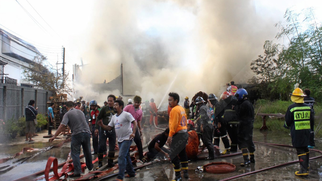เจ้าหน้าที่กำลังใช้น้ำสกัดเพลิงไหม้ บ.ไทยเซ็นเตอร์ รับเบอร์พาร์ท จก. ในซอยสุขสวัสดิ์ 22 เขตราษฎร์บูรณะ กทม. ที่เป็นโรงงานผลิตอะไหล่รถยนต์ คาดเหตุไฟฟ้าลัดวงจร ค่าเสียหายอยู่ระหว่างตรวจสอบ.