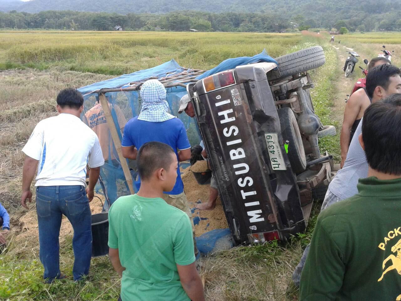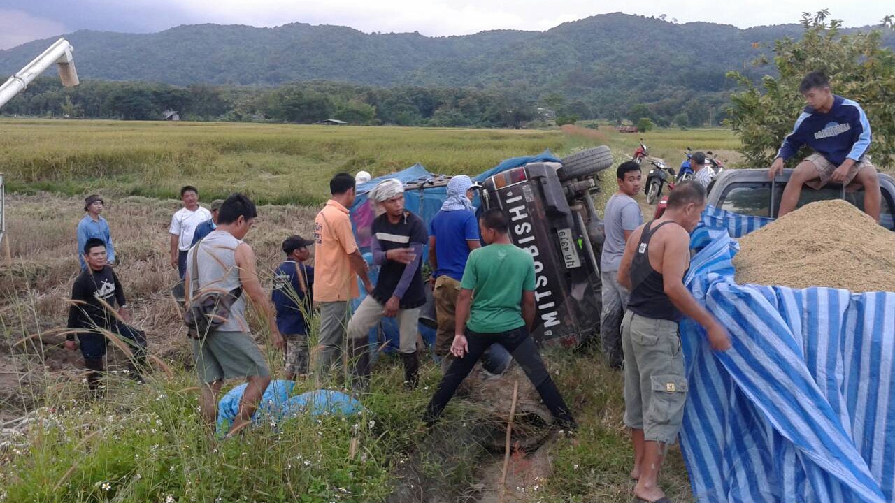 วันที่ 16 พ.ย.เมื่อเวลา 16.30 น.ที่บริเวณกลางทุ่งนา บ้านหนองทราย หมู่ที่ 17 ต.ป่าหุ่ง อ.พาน จ.เชียงราย นายวุฒิพงษ์ วงวุฒิ เจ้าของพื้นที่นาได้ว่างจ้าง รถเกี่ยวข้าวมาทำการเก็บเกี่ยวต้นข้าวที่ออกรวงเต็มทุ่งนา ท่ามกลางเมฆตั้งเค้าดำ ทำท่าฝนจะตกมาตั้งแต่เช้า ทำให้นายสาย แลปันติ 160 หมู่ที่ 6 ต.เวียงห้าว อ.พาน จ.เชียงราย คนขับรถเกี่ยวข้าว รีบเร่งเกี่ยวข้าวอย่างรวดเร็วทั้งกลางวันกลางคืน ก่อนเกิดเหตุในขณะที่นายสายขับรถเกี่ยวข้าวไปถ่ายเทข้าวเปลือกไปลงที่ท้ายรถกะบะ ยี่ห้อมิตซูบิชิ ทะเบียน บค -4319 เชียงราย ที่จอดรถอยู่ริมคันนาด้วยความรีบร้อนเกรงฝนจะตกลงมาทำให้ข้าวเปลือกได้รับความเสียหาย ภายหลังจากเทข้าวเปลือกหมดก็รีบกลับรถจะไปเกี่ยวข้าวต่อ ทำให้ลืมเก็บท่อส่งข้าว และเมื่อขับออกรถไป ท่อส่งข้าวได้ไปเกี่ยวกับโครงรถกระบะที่บรรทุกข้าวเปลือก พันธ์ กข.10 ที่มีอยู่กว่า 1 ตัน เสียหลักพลิกตะแคง ข้าวเปลือกกว่า 1 ตัน เทลงคันนา