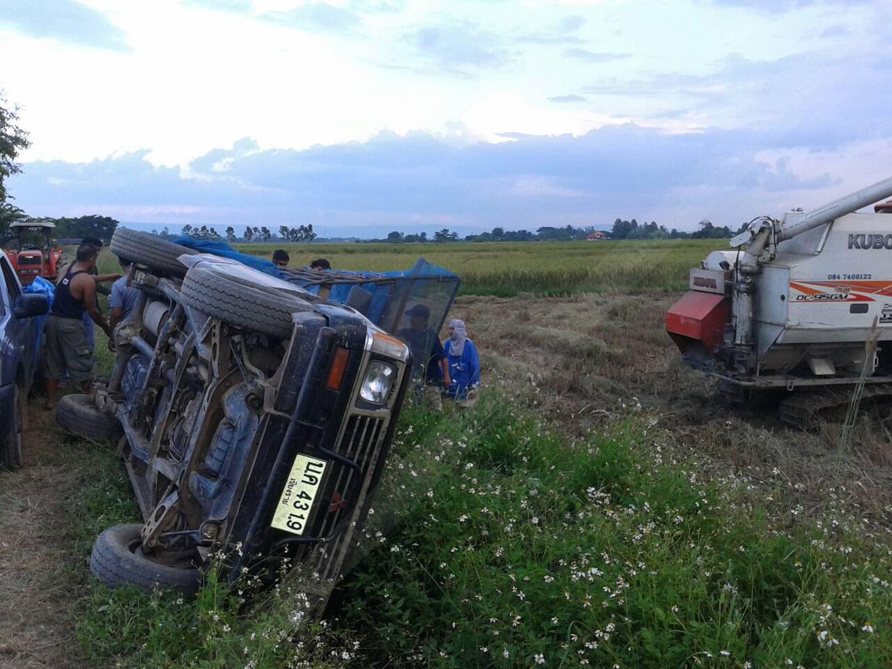 เดชะบุญขณะที่คนงานที่นั่งอยู่บนรถกะบะ 3คน เมื่อเห็นรถเกี่ยวข้าวลืมเก็บท่อส่งและไปเกี่ยวกับรถกระบะทำให้รถเริ่มตะแคง โดยคนขับรถเกี่ยวข้าวไม่เห็น จึงรีบตะโกนบอกแต่คนขับรถเกี่ยวข้าวไม่ได้ยินทั้งหมด จึงรีบกระโดดลงจากรถออกห่างรถที่พลิกตะแคงรอดตายอย่างวุดหวิด เป็นผลให้ข้าวเปลือกที่อยู่ท้ายกระบะ จำนวนกว่า 1 ตัน เทลงคันนาจำนวนมาก ชาวบ้านที่อยู่ข้างเคียง ได้รีบช่วยกันเก็บข้าวเปลือกอย่างรีบเร่ง และดึงรถบรรทุกข้าวที่ตะแคงอยู่กลับคืนมาในสภาพเดิม ก่อนจะเลิกทำงาน