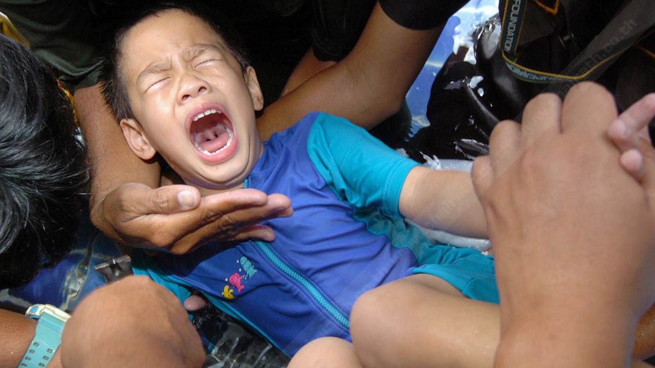 เจ้าหน้าที่กู้ภัยมูลนิธิร่วมกตัญญู กำลังช่วยเหลือ ด.ช.กรอนันต์ หรือน้องอั๋นอั๋น ขจรเดชพิศาล วัย 3 ขวบ ที่เล่นน้ำในสระแล้วมือติดท่อน้ำวน ในหมู่บ้านย่านตลิ่งชัน ใช้เวลากว่า 2 ชม.จึงช่วยได้อย่างปลอดภัย.