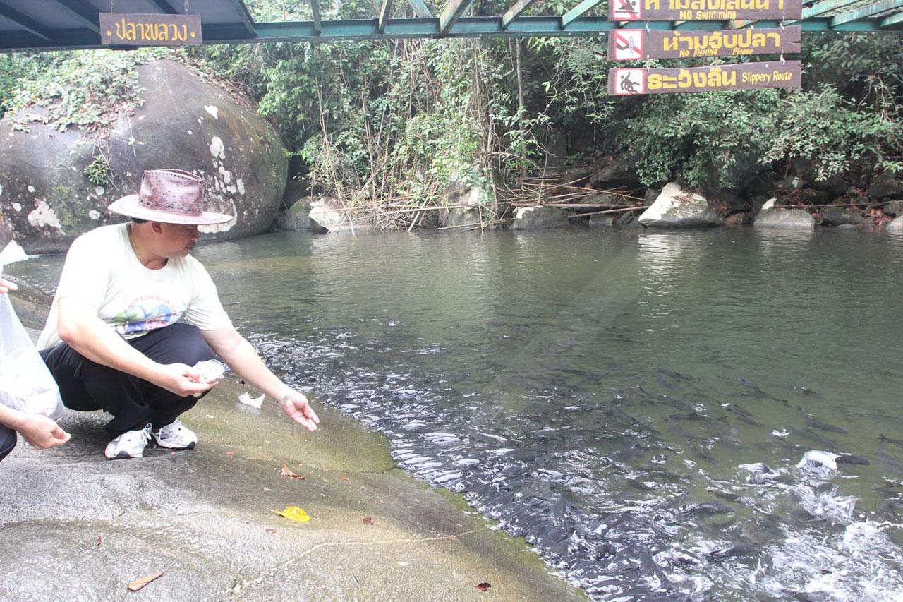 ซึ่งตนได้ฝึกให้อาหารเม็ดกับปลามา 1 ปี เพื่อให้เข้าแถวกินอาหารได้ผลคุ้มค่ามาก เข้าแถวเป็นหน้ากระดาน จากนั้น เมื่อปลาแถวแรกกินอาหารเสร็จจะถอยไปให้ปลาพลวงตัวอื่นมาเข้าแถวต่อ การให้อาหารมีส่วนจัดระเบียบให้เข้าแถวคือ ต้องค่อยๆ ให้ทีละน้อย กระจายให้ปลาพลวงได้กินอย่างทั่วถึงทุกตัว ขณะนี้มีนักท่องเที่ยวเข้ามาเที่ยวชมความน่ารักของพวกปลาเหล่านี้กันจำนวนมาก.