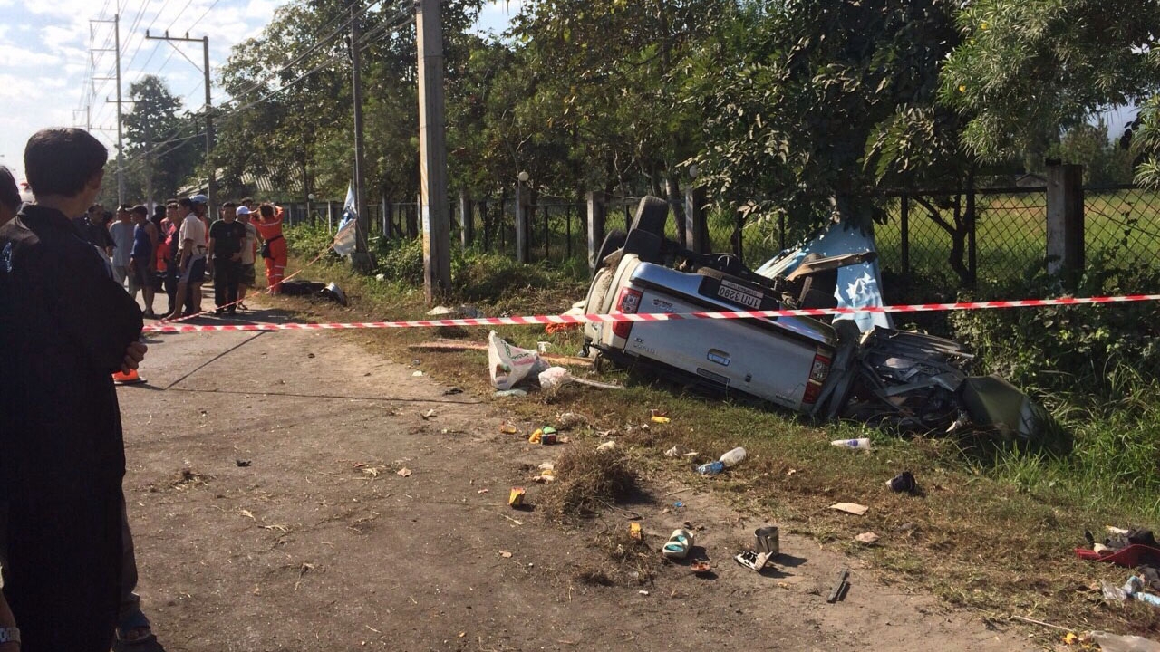 หนุ่มซิ่งกระบะวีโก้ ชนท้าย จยย. 2 คัน ก่อนจะหลบหนีและมาพลิกคว่ำ ทำให้พ่อที่บวชเป็นพระและแม่ดับอนาถ ขณะจะพาครอบครัวไปไหว้พระที่วัดต่างอำเภอ