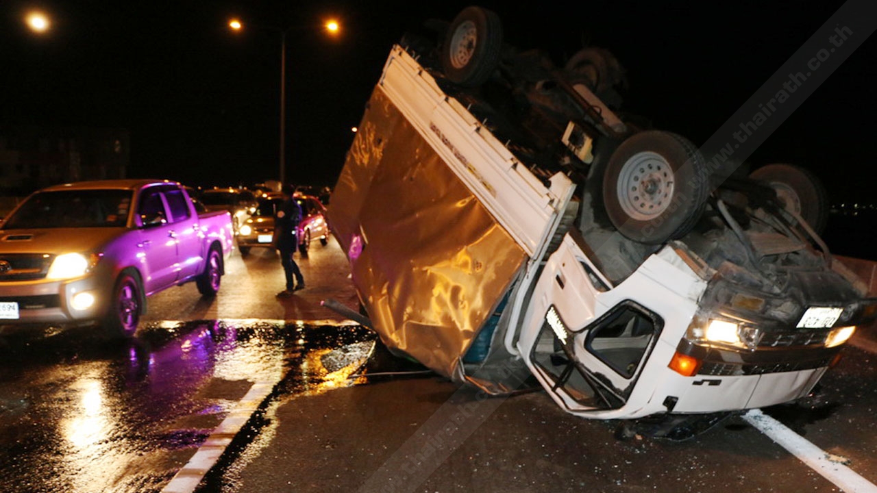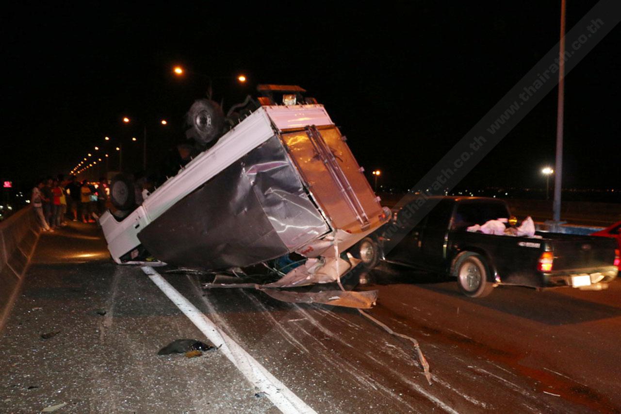 ที่เกิดเหตุ พบรถบรรทุกสี่ล้อเล็ก ยี่ห้ออีซูซุ สีขาว ทะเบียน บย 423 สระบุรี พลิกค่ำหงายท้อง โดยด้านหลังบรรทุกถังน้ำมันดีเซล ขนาด 200 ลิตร มาจำนวน 10 ถัง ทำให้น้ำมันไหลนองเต็มผิวการจราจร ส่วนคนขับได้รับบาดเจ็บทราบชื่อ นายสุระชัย จันทร์โท อายุ 28 ปี บ้านเลขที่ 135 ม.3 ต.วังหลวง อ.เฝ้าไร่ จ.หนองคาย ได้รับบาดเจ็บ เจ้าหน้าที่ทำการปฐมพยาบาลให้เบื้องต้น นอกจากนี้ ในที่เกิดเหตุ ยังมีรถกระบะ เชฟโรเลต สีบรอนซ์ ทะเบียน ตท 6521 กทม. ซึ่งรถเสียหลัก จากคราบน้ำมันบนพื้นถนน หมุนชนแบริเออร์ ได้รับความเสียหาย
