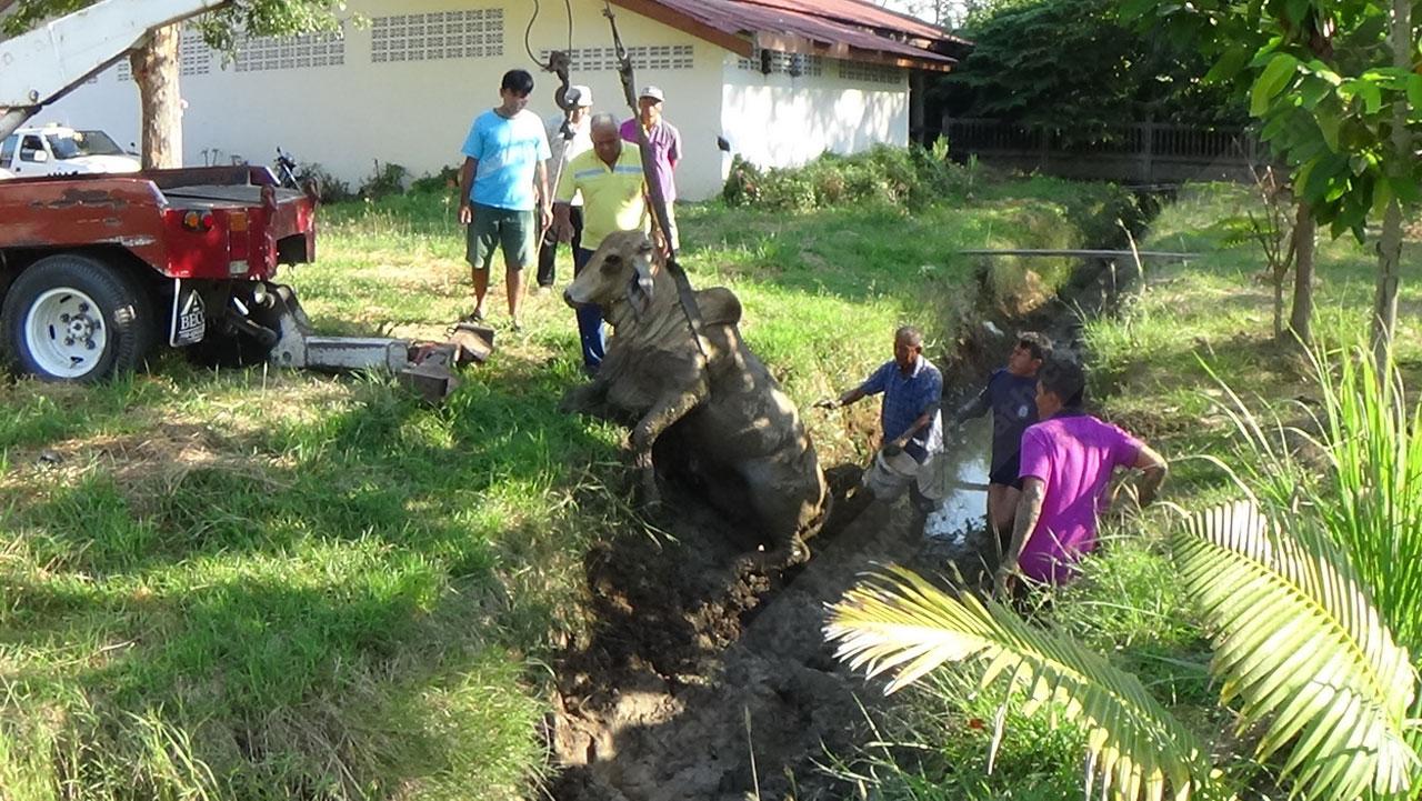 เจ้าหน้าที่วีอาร์กู้ภัยจังหวัดอ่างทอง นำรถยกช่วยเหลือ 'นางแดง' วัวหนักกว่า 500 กิโลกรัม ตกคูน้ำกลางเมืองอ่างทอง ลึกว่า 2 เมตร โชคดีขึ้นมาได้อย่างปลอดภัย...