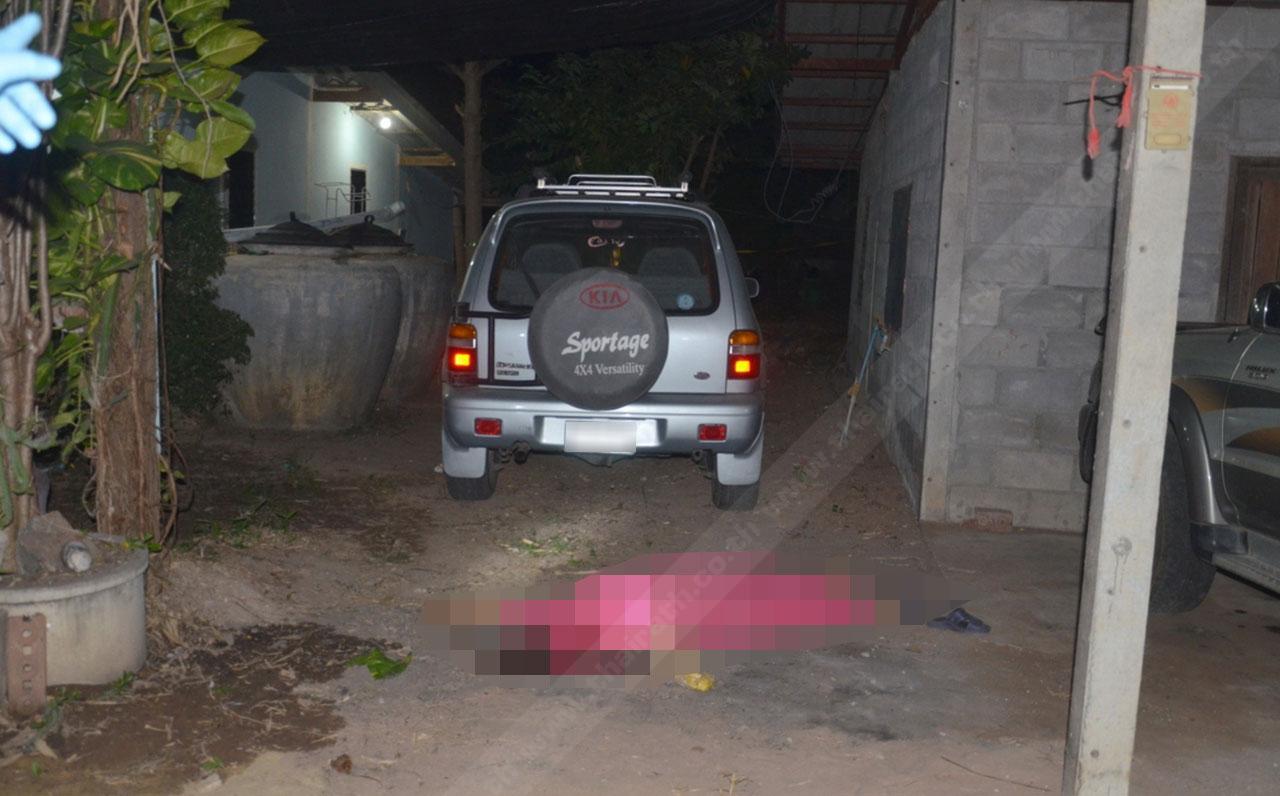 ส่วนหลังบ้าน พบศพนายพนอ หรือ นอ บ่อสะอาด อายุ 52 ปี อยู่บ้านเลขที่ 182 / 3 หมู่ 1 ต.หนองหญ้า อ.เมือง จ.กาญจนบุรี เสียชีวิตอยู่ข้างโต๊ะหินนั่งเล่น สภาพถูกยิงเข้าที่ขมับขวากระสุนฝังใน โดยมีปืนพกสั้น ขนาด .38 ซุปเปอร์ ตกอยู่ด้านซ้ายของศพ ห่างไปเล็กน้อย พบรถ จยย.ฮอนด้า ดรีม สีแดง หมายเลขทะเบียน ขจน 957 กาญจนบุรี ของนายพนอจอดอยู่