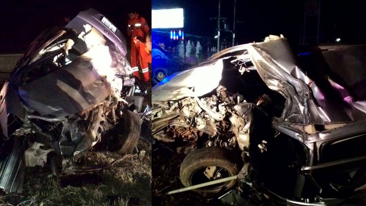 หนุ่มอุดร ชะตาขาดซิ่งเก๋งวีออสเสยท้ายรถพ่วงตกร่องกลางถนนสายอุดรธานี-สกลนคร ดับคาที่