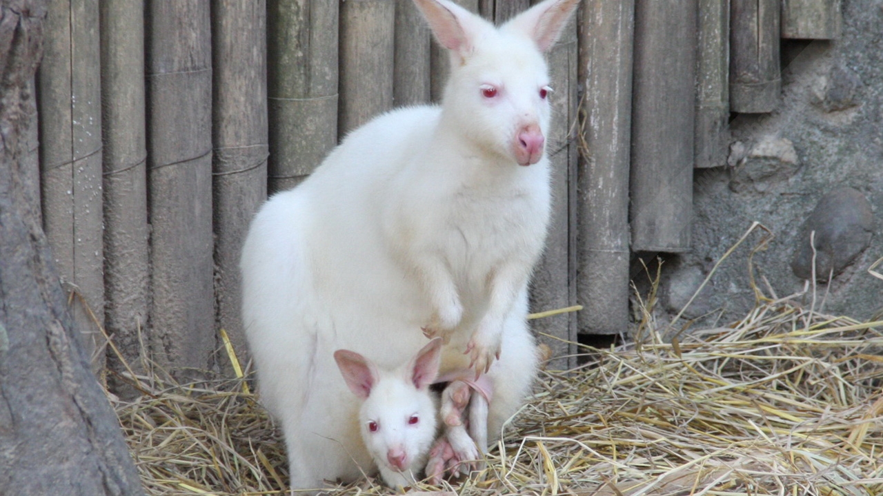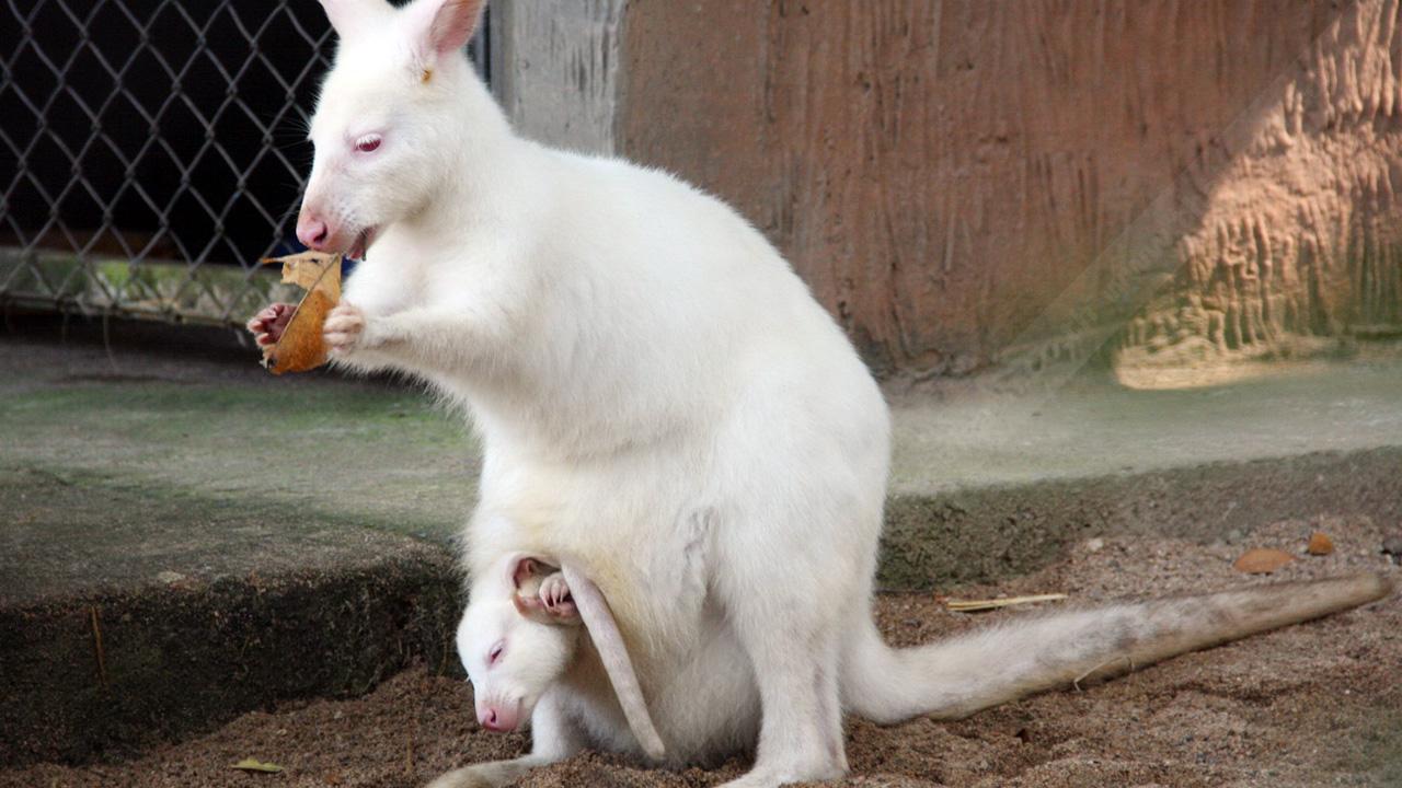 สำหรับวัลลาบีเผือก เป็นสัตว์ป่าท้องถิ่นของประเทศออสเตรเลีย เป็นสัตว์ในตระกูลจิงโจ้ แต่มีขนาดเล็กกว่า โดยตัวโตสมบูรณ์มีขนาดจากหัวถึงหาง วัดได้กว่า 1 เมตร น้ำหนักเฉลี่ย 11-26 กิโลกรัม อายุเฉลี่ย 3 ปี มีลักษณะคล้ายกับจิงโจ้ปกติ หางที่ยาวและแข็งแรงเป็นอวัยวะสำคัญใช้ในการทรงตัวและกระโดด มีกระเป๋าหน้าท้องสำหรับเลี้ยงลูกเหมือนจิงโจ้ ซึ่งลูกวัลลาบี จะอยู่ในกระเป๋าหน้าท้องถึงอายุ 1ปีครึ่ง มีลักษณะพิเศษสีขาวทั้งตัว เกิดจากความผิดปกติของเม็ดเลือด และจัดเป็นสัตว์หายากที่อยู่ในบัญชีสัตว์ป่าคุ้มครองของออสเตรเลียอีกด้วย