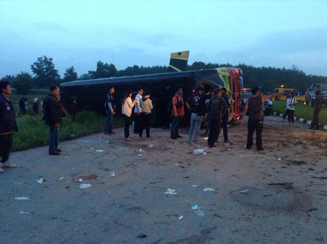 สำหรับผู้โดยสารบนรถบัสดังกล่าว เป็นเจ้าหน้าที่ กทม.สำนักงานเขตทวีวัฒนา จำนวน 43 คน เดินทางมาจากกรุงเทพฯ เพื่อไปสัมมนาที่จ.กระบี่ แต่ระหว่างทางเกิดพลิกคว่ำ เบื้องต้นมีผู้บาดเจ็บ 21 ราย สาหัสอีก 3 ราย เจ้าหน้าที่กู้ภัยมูลนิธิกุศลศรัทธา ให้การช่วยเหลือนำส่งโรงพยาบาลเคียนซา และโรงพยาบาลบ้านนาเดิม ส่วนรายชื่อผู้บาดเจ็บ จะรายงานความคืบหน้าต่อไป.