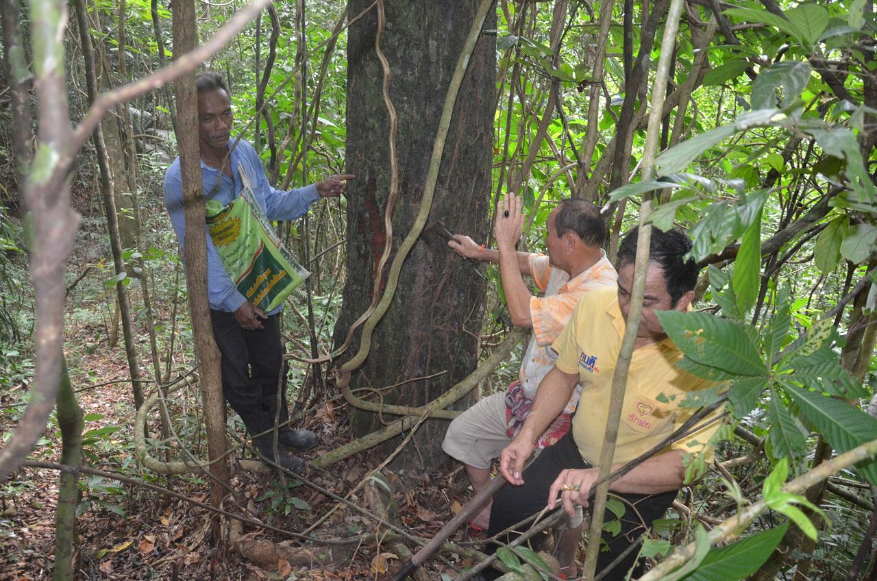 ผู้สื่อข่าวจึงเดินทางไปตรวจสอบเรื่องนี้ จุดที่พบต้นไม้มหัศจรรย์บนเทือกเขานมสาว อยู่ห่างจากถนน 4006 หลังสวน-ราชกรูด ประมาณ 10 ก.ม. เป็นเทือกเขาสูงที่สุดใน อ.พะโต๊ะ จัดเป็นป่าดิบชื้นมีพันธุ์ไม้นานาชนิดขึ้นอยู่อย่างอุดมสมบูรณ์และยังเป็นป่าต้นน้ำของแม่น้ำหลังสวน พบต้นไม้ใหญ่ขนาดลำต้นเท่ากับ 2 คนโอบ ยืนต้นตรง ความสูงของต้นจากพื้นดิน สูงประมาณ 25 เมตร ขึ้นอยู่ที่ระดับความสูงประมาณ 300 เมตรจากตีนเขา ลักษณะผิวเปลือกไม้ด้านนอกขรุขระ เป็นสีน้ำตาลไหม้ หนาประมาณ ครึ่งเซนติเมตร ผู้สื่อข่าวจึงทดสอบเอาขวานฟันแบบถากในลักษณะเฉียงเป็นมุม 60 องศาไปที่เปลือกไม้ ปรากฏว่าแข็งมากเหมือนเหล็กจนเกิดประกายไฟวูบวาบตามคำบอกเล่า