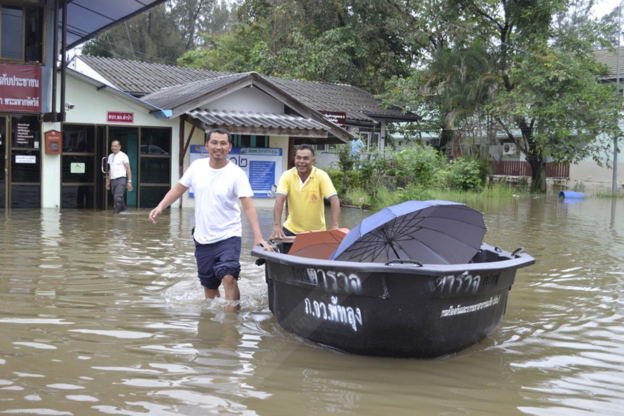 ส่วนของพื้นที่ อ.เมืองพัทลุง นั้น ยังมีน้ำท่วมขังในพื้นที่ ต.ชัยบุรี ต.พญาขัน ต.ลำปำ โดยเฉพาะ ต.ลำปำ นั้น ชาวบ้านท้องที่ ม.4 ต.ลำปำ ประมาณ 40 ครัวเรือน ถูกตัดขาดจากโลกภายนอก เพราะเส้นทางเข้าหมู่บ้านระดับน้ำท่วมประมาณ 1.5 เมตร ทำให้รถเล็กไม่สามารถสัญจรผ่านไปมาได้ ชาวบ้านต้องใช้เรือพายในการสัญจรไปมาเท่านั้น