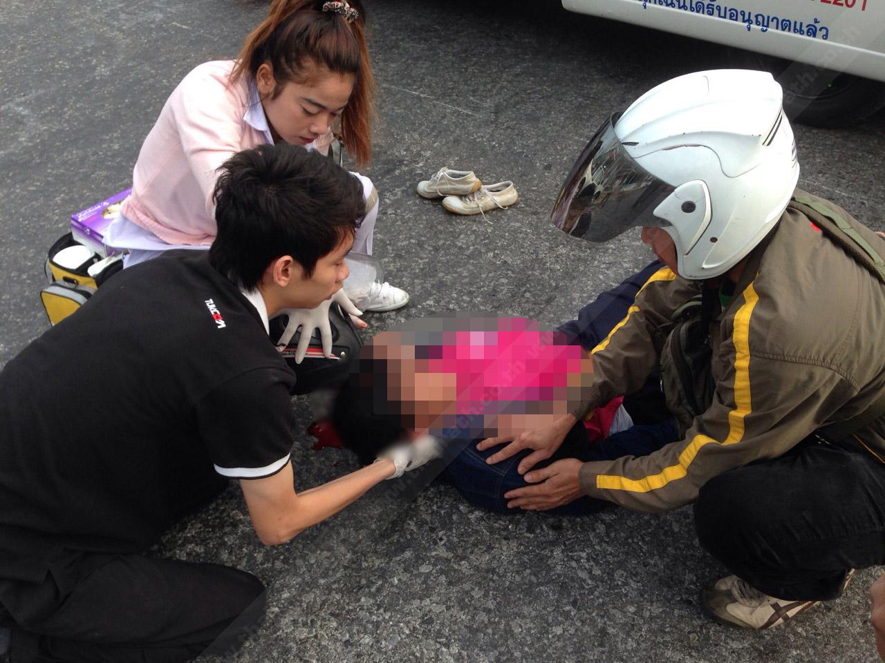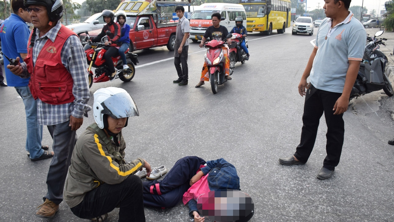 เดชะบุญ! ใส่หมวกกันน็อก สาว 16 จ.ชลบุรี ขี่ จยย.โดนกระบะตัดหน้า ทำรถล้ม ถูกล้อเหยียบหัวซ้ำ ไม่ตาย แต่บาดเจ็บสาหัส ขณะคนขับปิกอัพ เร่งเครื่องขับหนีลอยนวล