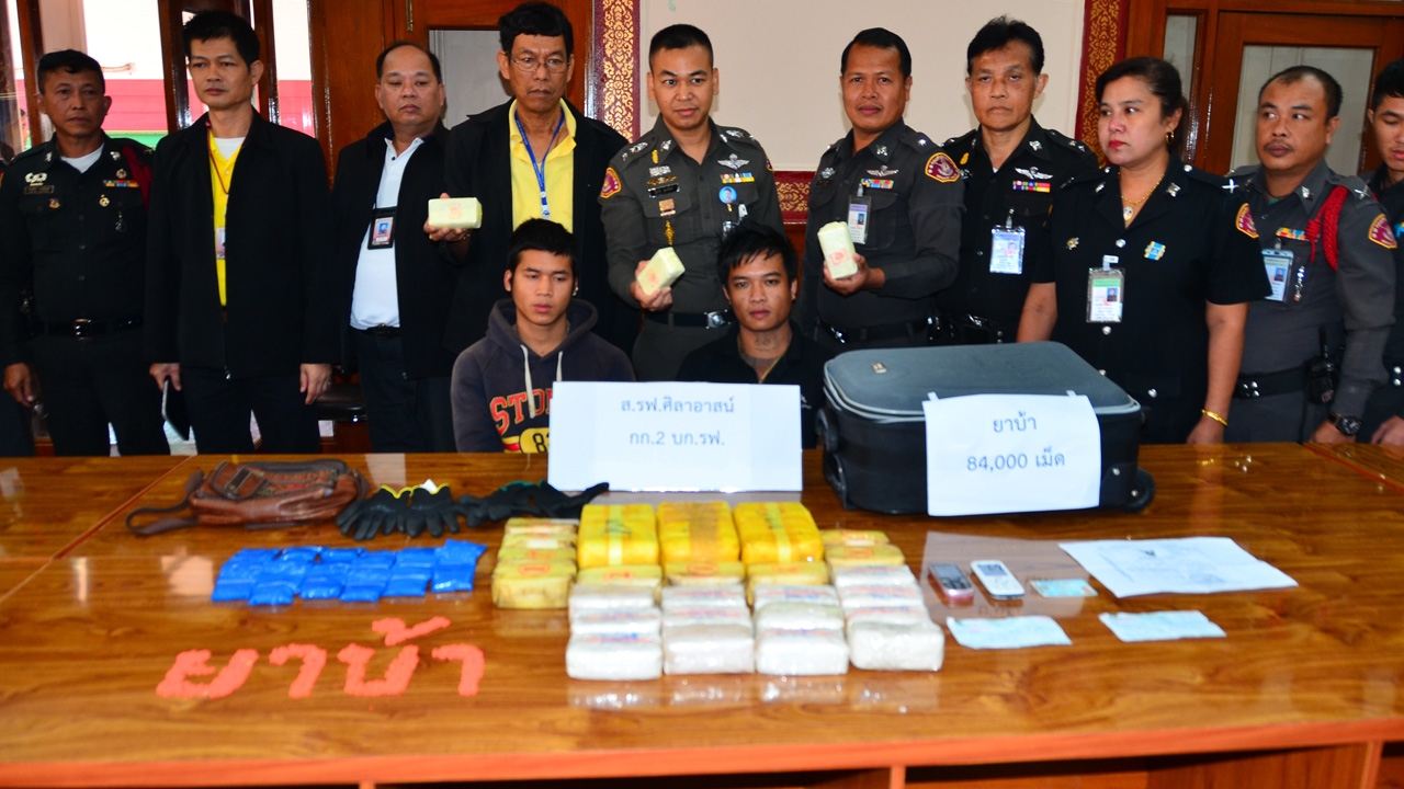เมื่อเวลา 10.00 น. วันที่ 27 ธ.ค. 57 ที่ห้องประชุมสถานีรถไฟเชียงใหม่ พ.ต.ท.ปิยรัช สุภารัตน์ สว.ส.รฟ.ศิลาอาสน์ กก.2 บก.รฟ. พร้อมกับตำรวจรถไฟ ร่วมแถลงการจับกุม 2 ผู้ต้องหา ลักลอบขนยาบ้า จำนวน 84,000 เม็ด ขึ้นรถนอนจากสถานีเชียงใหม่ไปลงที่สถานีหัวลำโพง กรุงเทพฯ โดยผู้ต้องหาที่ถูกจับได้ 2 คน มี นายอะหล่อ มาเยอะ อายุ 20 ปี ชาวเขาเผ่าอาข่า อยู่หมู่ 11 ต.ป่าตุ้ม อ.พร้าว จ.เชียงใหม่ และนายสุริยนัน แก้วใหญ่ อายุ 24 ปี อยู่หมู่ 1 ต.ป่าตุ้ม อ.พร้าว จ.เชียงใหม่ ตำรวจสามารถจับกุมผู้ต้องหาทั้งสองได้ ขณะกำลังลากกระเป๋าเดินทางขึ้นตู้รถไฟขบวนรถนอนเชียงใหม่-กรุงเทพฯ และมีอาการพิรุธ ตำรวจรถไฟเข้าขอตรวจค้น พบยาบ้าในกระเป๋าเดินทางดังกล่าว ก่อนนำตัวมาสอบสวน