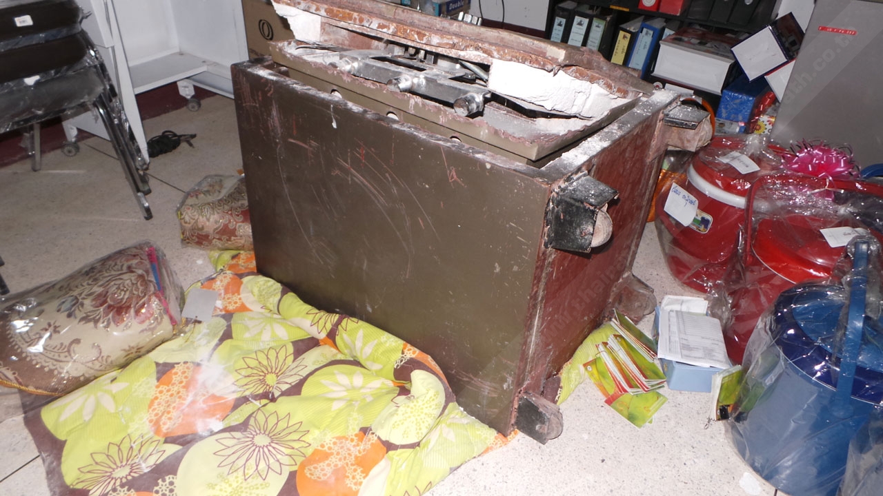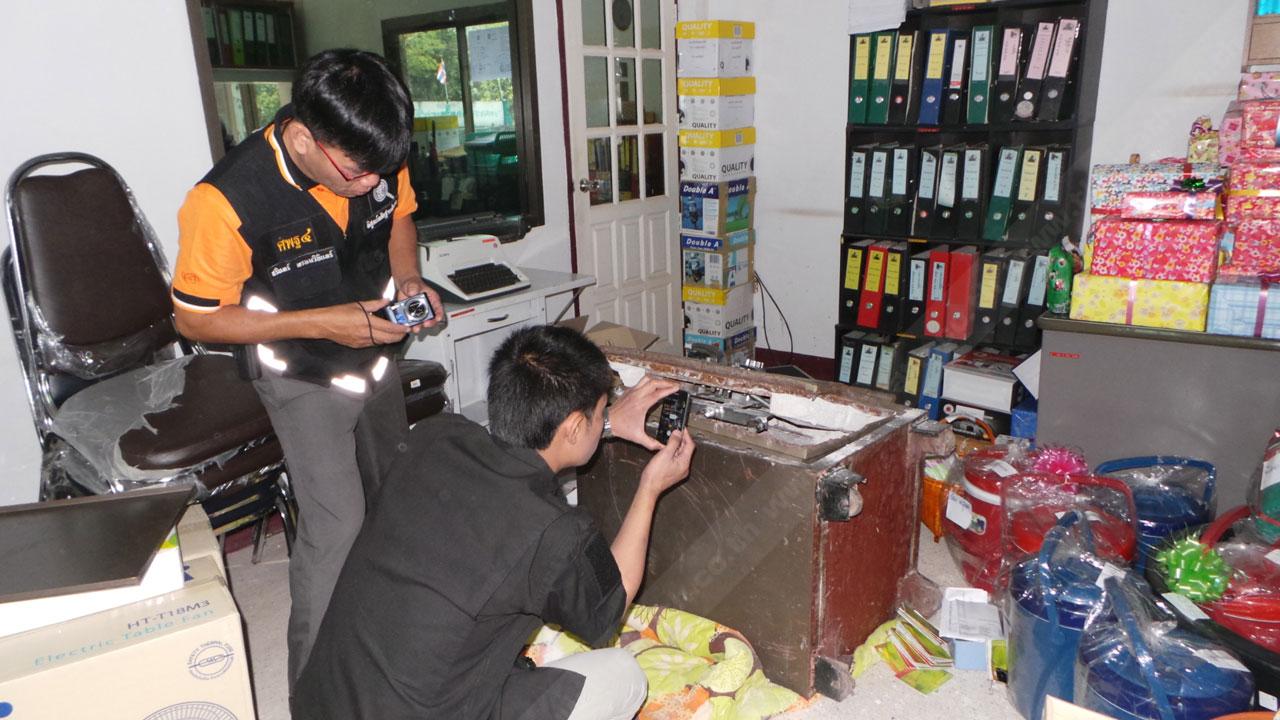 ที่เกิดเหตุ พบนายวิษณุ โคตรตาแสง อายุ 33 ปี หัวหน้าวิศวกรของบริษัทฯ และนางสาววิภาวดี คำโคตร อายุ 35 ปี พนักงานสมุห์บัญชี และเป็นหัวหน้าพนักงานภายในออฟฟิศ รับผิดชอบรายรับรายจ่าย และเงินที่ถูกคนร้ายโจรกรรมไป นำตำรวจเข้าตรวจสอบภายใน พบร่องรอยคนร้ายใช้ของแข็งงัดตัวล็อกหน้าต่างด้านข้างออฟฟิศพังเสียหาย ก่อนเข้ามาภายในห้องเก็บตู้เซฟ และพบตู้เซฟ ขนาดใหญ่ กว้าง 80 ซม. สูง 120 ซม. หนักประมาณ 500 กิโลกรัม นอนอยู่บนพื้นห้องที่ปูด้วยผ้าห่ม สภาพประตูตู้เซฟถูกคนร้ายใช้ของแข็งงัดจนพังเสียหาย ใช้การไม่ได้ คาดคนร้ายใช้เหล็กชะแลงขนาดใหญ่งัดเปิดออกขโมยเอาเงิน 4.5 แสนบาท หลบหนีไป โดยก่อเหตุช่วงกลางดึกคืนที่ผ่านมาซึ่งเป็นวันหยุด