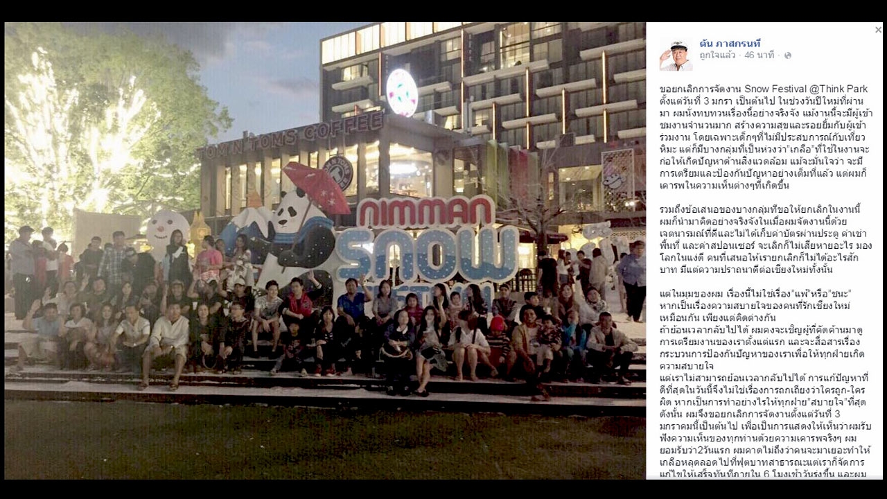 เมื่อวันที่ 1 ม.ค. มีรายงานว่านายตัน ภาสกรนที หรือตัน อชิตัน นักธุรกิจชื่อดัง ได้ชี้แจงผ่านเฟซบุ๊กส่วนตัว ยกเลิกการจัดงาน “ Snow Festival @Think Park “ ตั้งแต่วันที่ 3 ม.ค. เป็นต้นไป ภายหลังได้จัดกิจกรรม Nimman Snow Land Festival เป็นครั้งแรกกลางเมืองจ.เชียงใหม่ ซึ่งมีการจำลองดินแดนหิมะ พร้อมบรรยากาศหนาวสุดขั้ว โดยงานเริ่มมาตั้งแต่วันที่ 20 ธ.ค.2557 ที่ผ่านมา และตามกำหนดการจะสิ้นสุดในวันที่ 4 ม.ค. 2558 นี้ แต่กลับมีกระแสในโลกโซเชียล ทั้งข้อดีและข้อเสียมาอย่างต่อเนื่อง