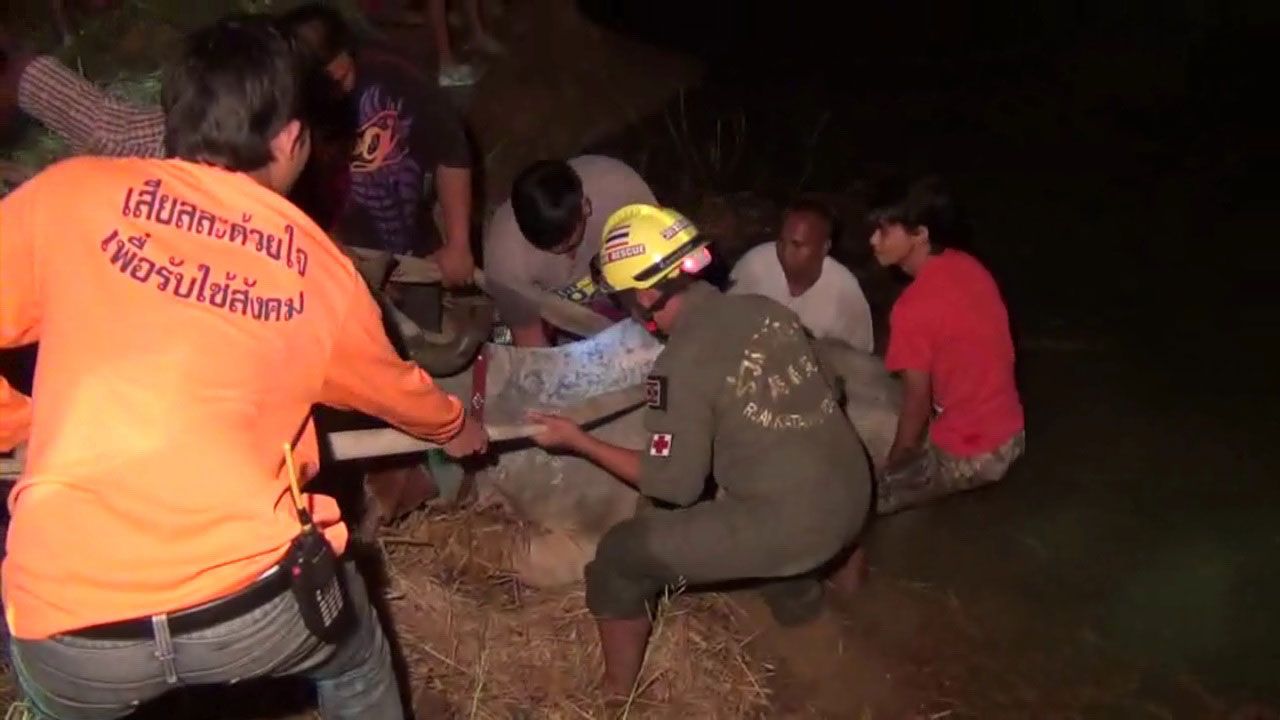 เจ้าหน้าที่มูลนิธิฯ และชาวบ้านใช้ช่วยกันนำสายพานขนาดเล็กร้อย ตามลำตัวดึงขึ้น ส่วนด้านท้ายลำตัวแม่วัวชาวบ้านช่วยกันดันอย่างสุดกำลัง แต่ไม่สามารถพยุงตัวขึ้นได้ เนื่องจากแม่วัว มีอาการอ่อนล้า หมดแรง เพราะสระน้ำลึกมาก สุดท้าย มูลนิธิฯและชาวบ้านต่างช่วยกันลงไปในสระน้ำ เพื่อช่วยกันดันลำท้ายตัวของแม่วัว ขึ้นใช้เวลานานกว่า หนึ่งชั่วโมงเศษ จึงสามารถนำแม่วัวท้องแก่สภาพหมดแรงขึ้นจากตลิ่งได้