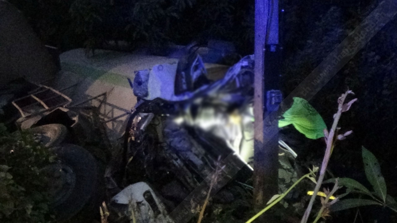 อ่างทอง รถบรรทุกอาหารสัตว์ชนท้ายรถพ่วงบรรทุกน้ำตาล ทำคนขับเสียชีวิต ติดภายในรถ หลังตกลงไปข้างทางเสยเสาไฟฟ้า ตร.เตรียมสอบผู้เห็นเหตุการณ์