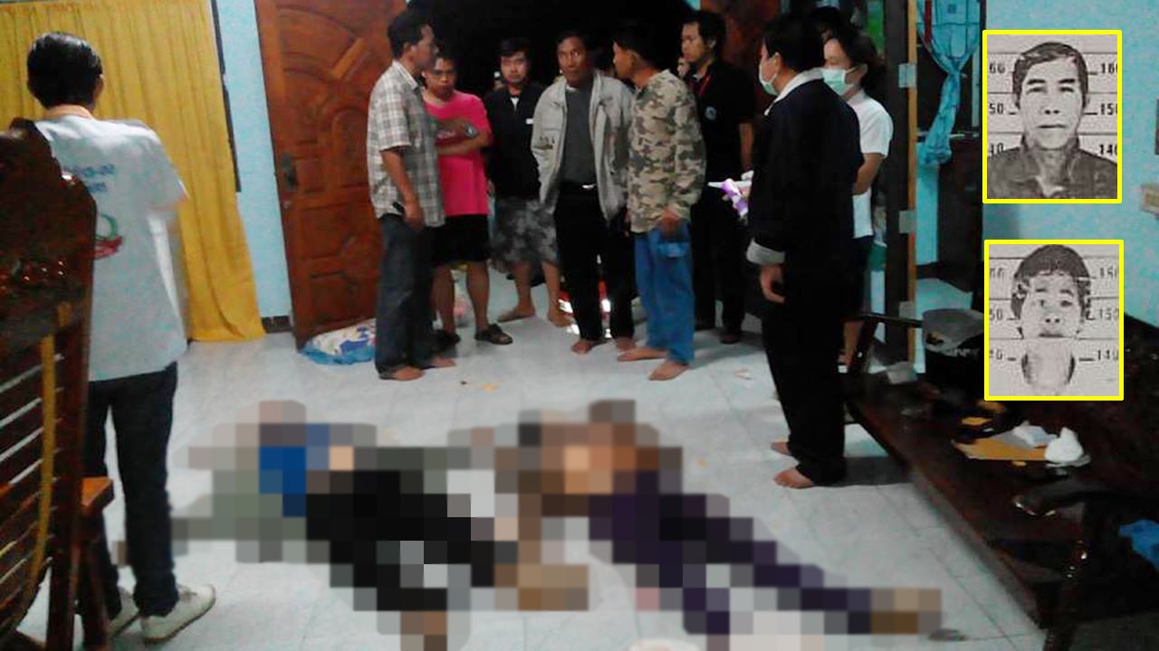 บริเวณกลางบ้าน พบศพผู้เสียชีวิต 2 ราย ทราบชื่อ นางปิ่น ชื่นสุวรรณ อายุ 56 ปี เจ้าของบ้าน นอนหงายเสียชีวิต ในสภาพถูกยิงด้วยปืนแก๊ป กระสุนเข้าเต็มหน้าอกซ้าย ตัดขั้วหัวใจ ใกล้ๆ กันพบศพ นายเทียน มาคำสาย อายุ 60 ปี นอนหงายเสียชีวิต ในสภาพถูกยิงด้วยปืนขนาดเดียวกัน เข้าที่ปากกระสุนทะลุออกท้ายทอย เลือดทะลักนองพื้น บริเวณปากมีคราบเขม่าดินปืนติดอยู่จำนวนมาก ใกล้ศพเจ้าหน้าที่พบปืนแก๊ปยาวที่ใช้ก่อเหตุตกอยู่ พร้อมขวดเปล่าเหล้าขาว 1 ขวด