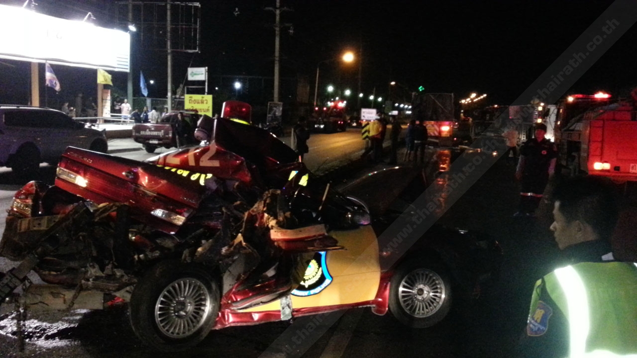 จากการตรวจสอบพบ สภาพด้านหน้ารถชนติดอยู่กับท้ายรถพ่วง 22 ล้อ ยี่ห้ออีซูซุ สีขาว หมายเลขส่วนหัว 71-5646 สงขลา หมายเลขพ่วงส่วนท้าย 71-5647 สงขลา มีนายทศพร จรรยาปิยพงศ์ อายุ 40 ปี อยู่หมู่ 3 ต.นาพร อ.พระพรหม จ.นครศรีธรรมราช เป็นคนขับ สภาพหน้ารถเก๋งตำรวจทางหลวงมุดอยู่ท้ายรถพ่วง ฝากระโปรงหน้ายุบโก่งงอ กระจกหน้าแตก นอกจากนี้ทางด้านท้ายรถ ยังพบรอยถูกชนอย่างแรง จนกระโปรงรถด้านหลังเปิดพังยับเข้ามาถึงห้องโดยสารด้านหลัง ใกล้กันพบรถบรรทุ 6 ล้อ สีขาว ติดสติ๊กเกอร์สีขาว “แม่ช้อยนางรำ” หมายเลขทะเบียน 71-3947 นครปฐม มีนายพลเทพ ชื่นชวน 54ปี อยู่หมู่5 ต.สายห้วยแก้ว อ.บ้านหมี่ จ.ลพบุรี เป็นผู้ขับ สภาพด้านหน้ามีรอยชนยุบ พลิกตะแคงอยู่กลางถนน