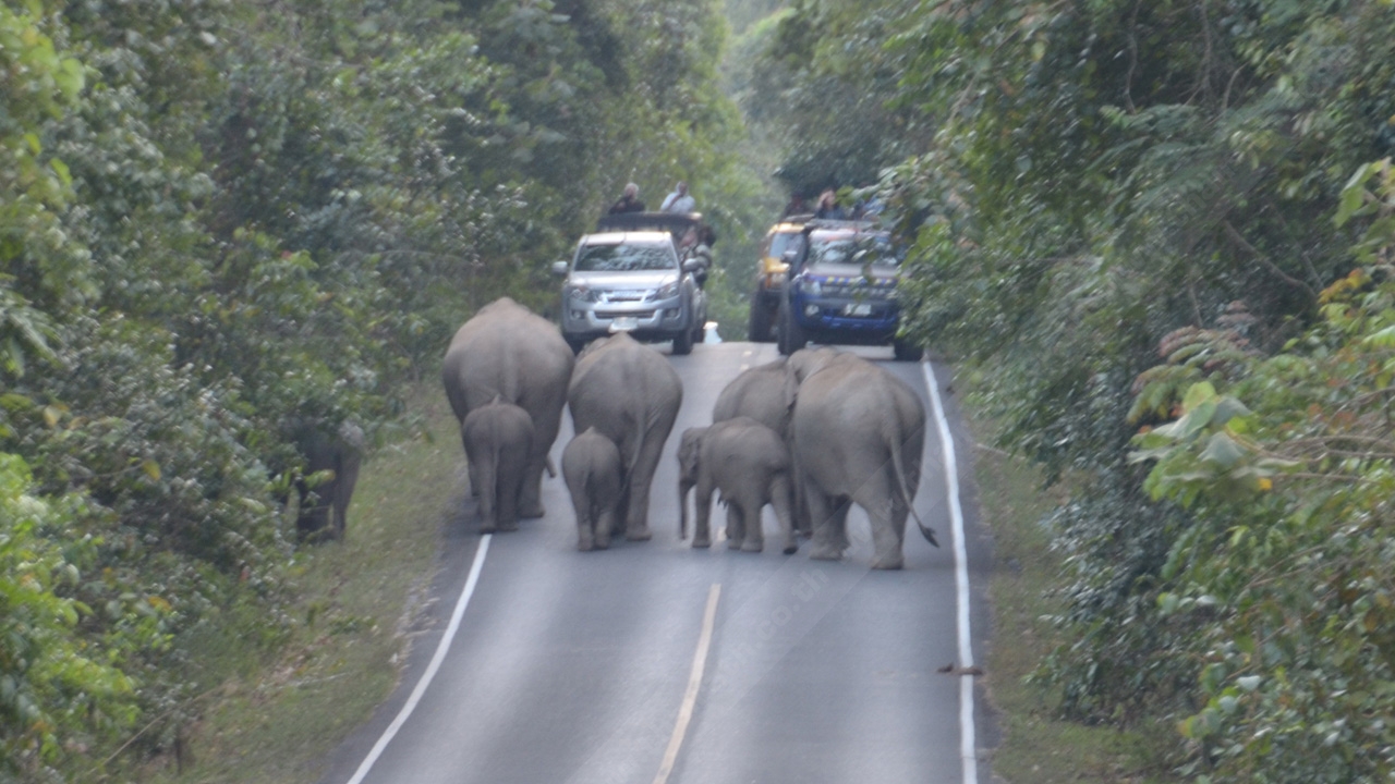 โขลงช้างป่าเขาใหญ่ พากันเดินกินหญ้าข้างทาง และขึ้นมาบนถนนระหว่าง กม.ที่ 34 – 37 ถนนสายปราจีน–เขาใหญ่ แต่เป็นช้างแม่ลูก ไม่ใช่พลายขี้โมโห จึงไม่มีการทำลายรถนักท่องเที่ยว เสนอแก้ปัญหาย้ายโป่งเทียมออกห่างถนน...