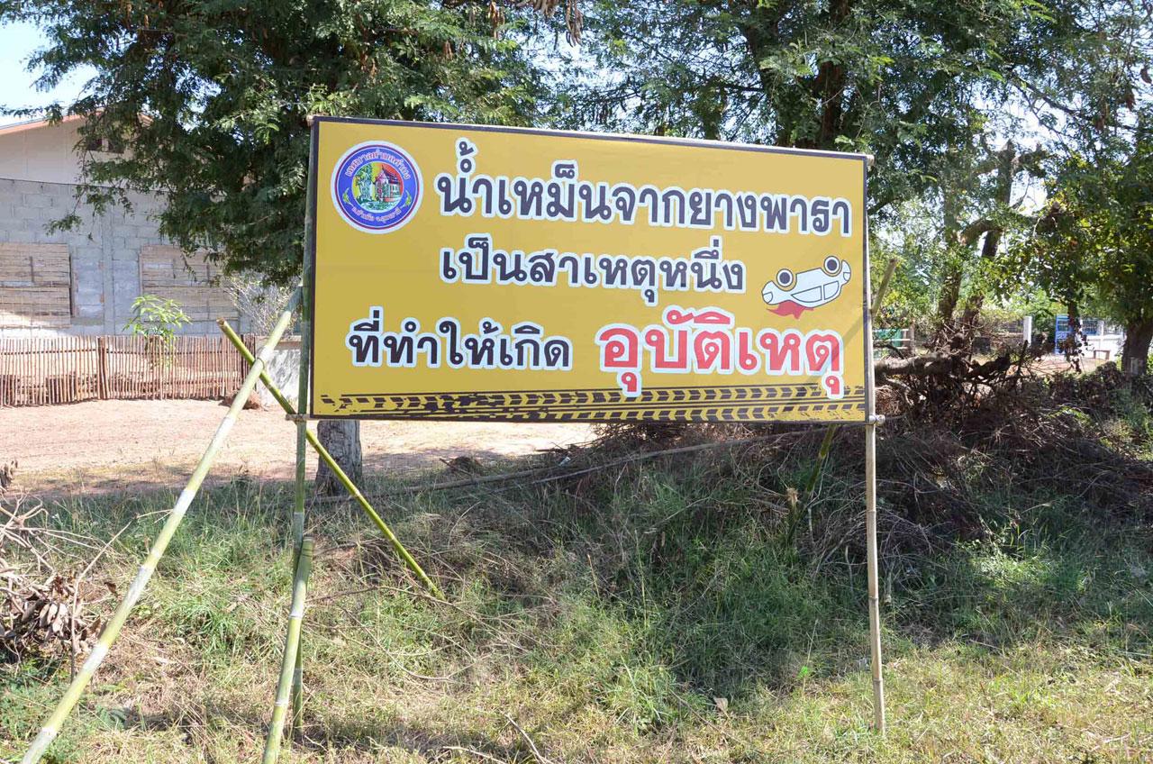 นายธวัชชัย กล่าวว่า รถบรรทุกยางก้อนถ้วย ที่มีน้ำกรดล้นไหลลงมาบนพื้นถนน ส่งกลิ่นเหม็น สร้างความเดือดร้อนให้ชาวบ้าน พอสะสมมากเข้าเมื่อมีฝนตกลงมาจะทำให้ถนนลื่น ซึ่งระยะหลังมานี้เกิดอุบัติเหตุมากและถี่จนขึ้นถึงเสียชีวิต ทางท้องถิ่นไม่นิ่งนอนใจได้ประชุมปรึกษาหารือกันในระดับตำบล อำเภอ หาแนวทางมาเป็นปีแล้ว จึงได้ติดป้ายเพื่อสะท้อนความเดือดร้อนของชาวบ้าน พร้อมกับบอกผู้ที่สัญจรไปมาให้ระมัดระวัง ว่ามีน้ำยาง ถนนลื่นเวลาฝนตก