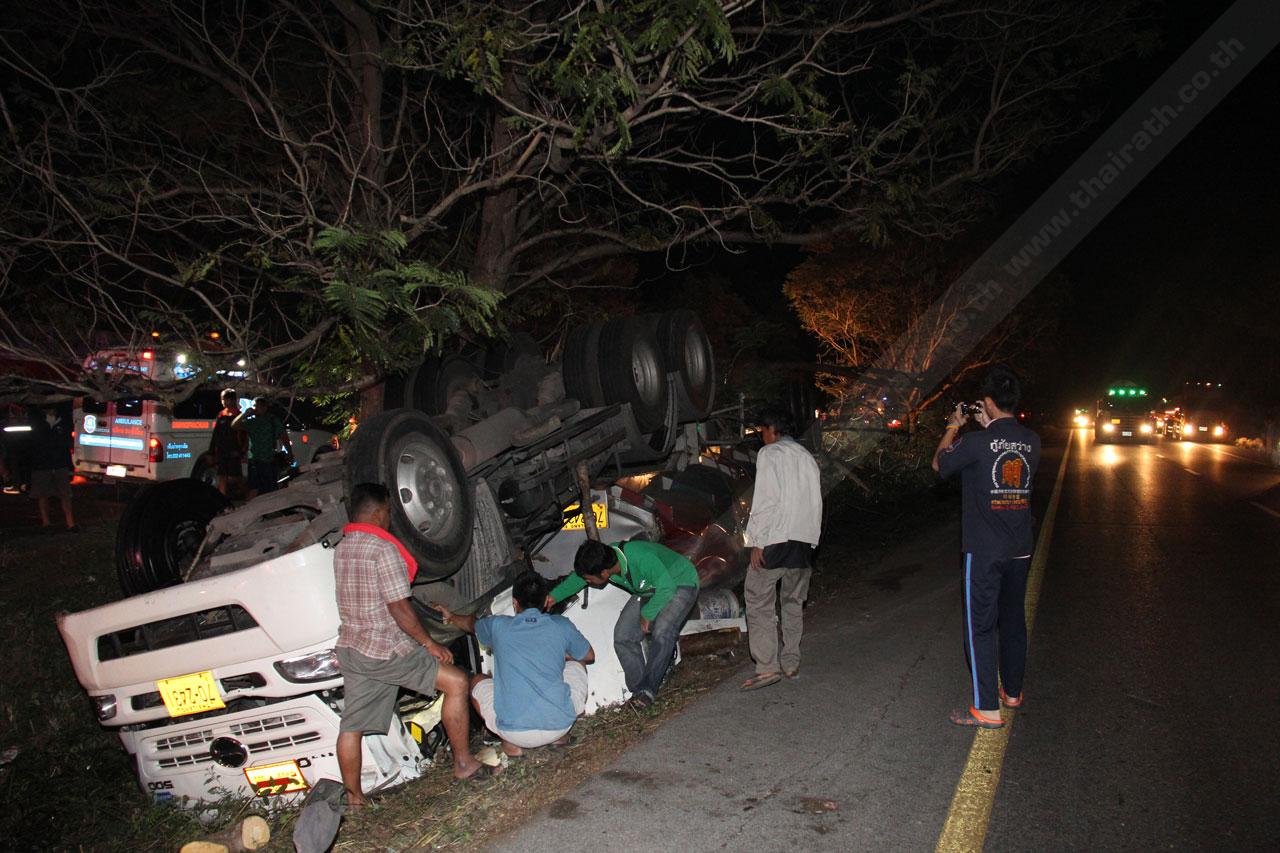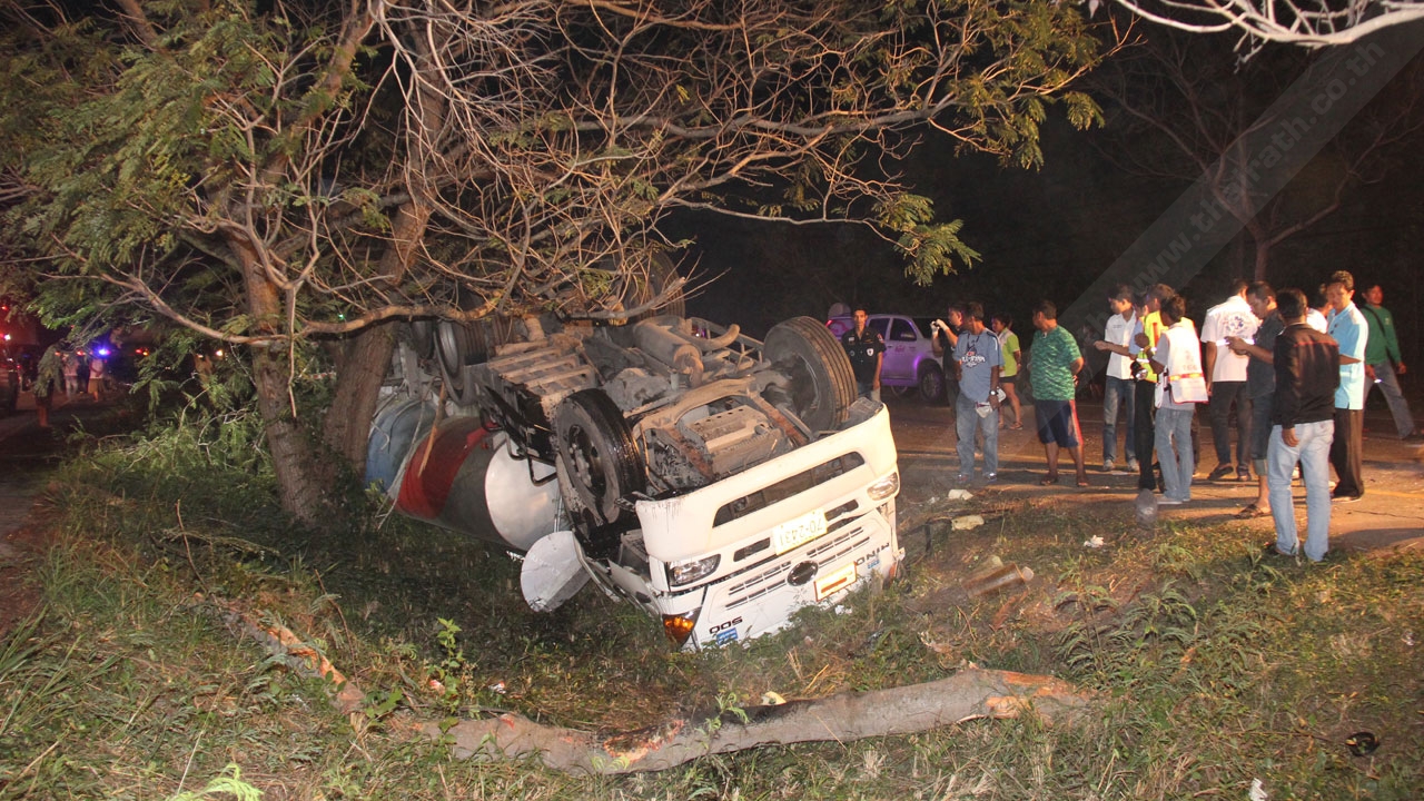 รถ 18 ล้อ บรรทุกน้ำมันปาล์มพลิกคว่ำชนต้นไม้ ตกร่องกลาง กิ่งไม้หักโดนเก๋งคัมรี่ที่ขับตามมา จนเสียหลักพุ่งชนต้นไม้ หม้อน้ำรถแตก ภายในรถมีเด็ก 2 ขวบนั่งมาด้วย โชคดีไม่มีใครเป็นอะไร แต่ได้ทำรถอีก 3 คันที่ตามมาไถลเพราะคราบน้ำมันพืช ทำรถขาขึ้น-ล่องใต้ติดหนึบ...
