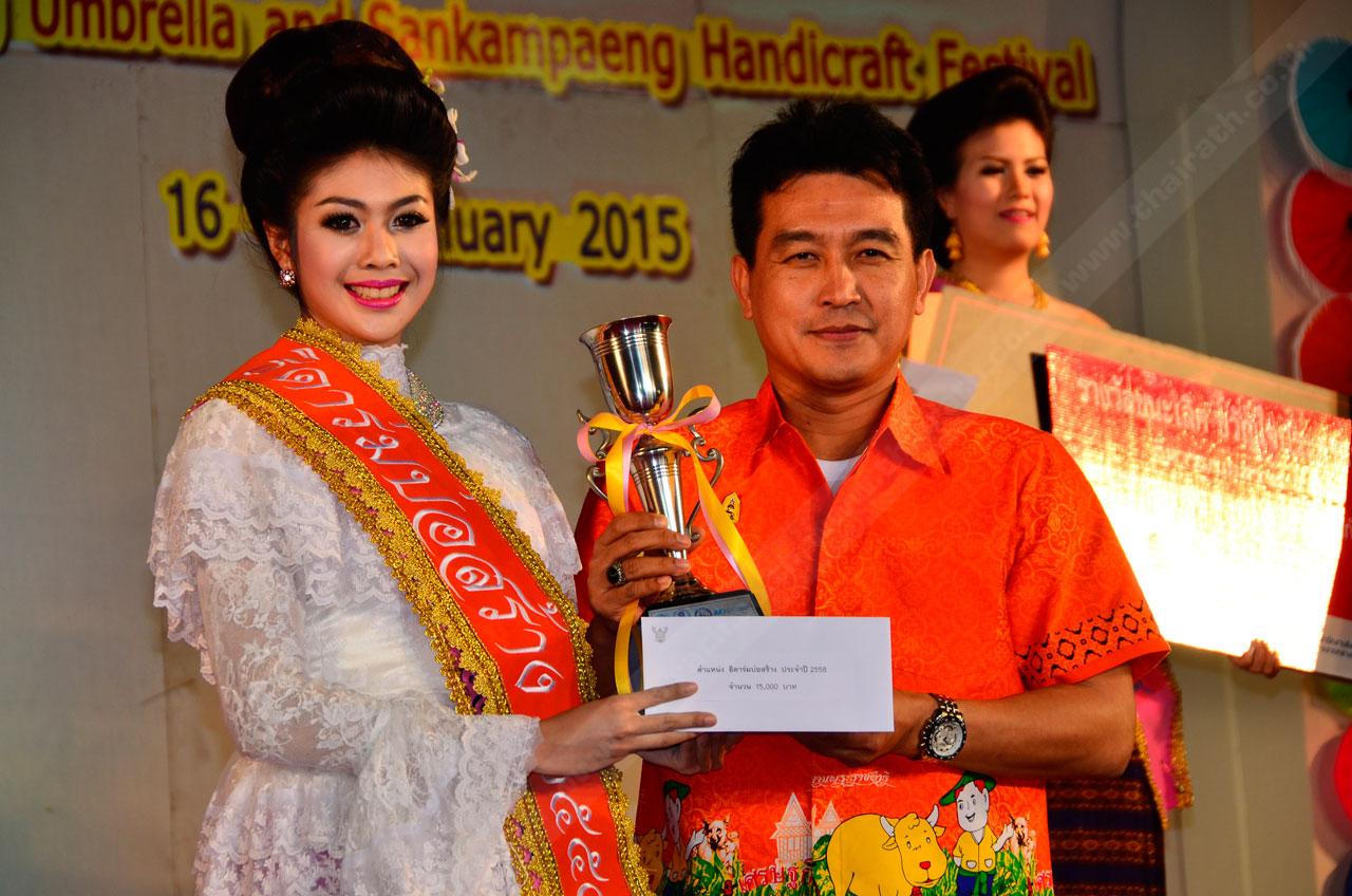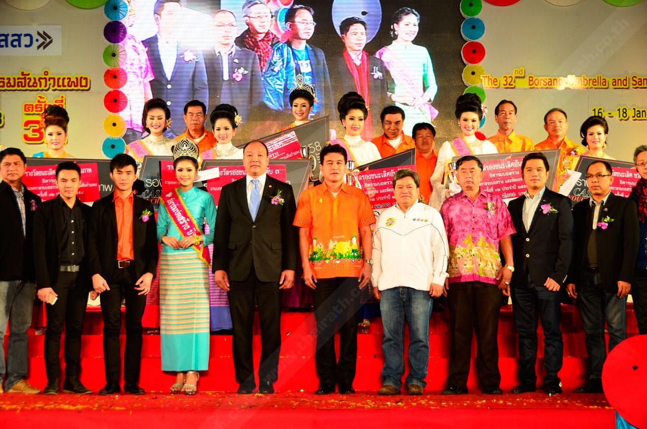 เมื่อเวลา 01.00 น. วันที่ 19 ม.ค. 2558 ที่ผ่านมา ที่เวทีการประกวดธิดาร่มบ่อสร้าง อ.สันกำแพง จ.เชียงใหม่ ในเทศกาลร่มบ่อสร้างและหัตถกรรมสันกำแพง ครั้งที่ 32 ได้มีการประกาศผลตัดสินธิดาร่มบ่อสร้าง โดยมีผู้สมัครเป็นนักศึกษาในระดับอุดมศึกษาจากมาหาวิทยาลัยต่างๆ ในภาคเหนือมาสมัครกันเป็นจำนวนมาก ทางคณะกรรมการได้คัดเลือกให้เหลือ 30 คน จากนั้นได้นำสาวงามผู้เข้าประกวดทั้งหมด ร่วมกิจกรรมเผยแพร่ประชาสัมพันธ์การทำร่มของหมู่บ้านบ่อสร้าง และประกวดแม่หญิงามขี่รถถีบกางจ้อง อันเป็นสัญลักษณ์ของร่มบ้านบ่อสร้างให้อนุชนรุ่นหลัง โดยสาวงามผู้เข้าประกวดทั้งหมด ได้แต่งชุดไทยล้านนาร่วมสมัยเข้าเดินโชว์ ให้คณะกรรมการผู้ทรงคุณวุฒิได้คัดเลือก จาก 30 นางสาว เหลือ 15 นางสาว สลับกับการแสดงวงดนตรีลูกทุ่งของวิทยาลัยโปลิเทคนิคลานนาเชียงใหม่ ท่ามกลางอากาศที่หนาวเย็น แต่กองเชียรก็ยังปักหลักเชียร์อยู่ข้างเวที