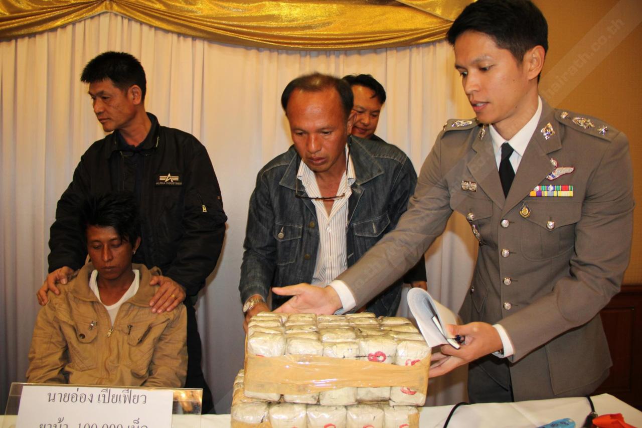 พล.ต.ท.วีระวุฒิ เผยว่า เมื่อวานนี้ (19 ม.ค.58) พ.ต.อ.ทรงกริช ผกก.แม่สาย ได้รับรายงานว่า มีการลักลอบนำยาเสพติดข้ามชายแดนมาพักในพื้นที่ จึงสั่งการให้ พ.ต.ท.เทคนิค จันสี สว.สส.สภ.แม่สาย นำชุดจับกุมออกติดตามตรวจสอบ จนกระทั่งพบนายอ่อง เปีย เฟียว ผู้ต้องหาดังกล่าว กำลังขับขี่รถ จยย. ฮอนด้า รุ่นไอคอน สีชมพูทะเบียน คจบ 825 เชียงราย ผ่านไปตามถนนหมู่บ้านไม้ลุงขน ม.10 ต.แม่สาย อ.แม่สาย จึงเรียกหยุดตรวจค้น แต่ไม่พบสิ่งของผิดกฎหมาย แต่เมื่อขยายผล เข้าตรวจค้นที่ตึกแถวเลขที่ 812/4 ม.10 ต.แม่สาย ที่นายอ่อง เปีย เฟียว เช่าอยู่พบยาบ้า 25 มัด มัดละ 2,000 เม็ด ที่หน้าห่อมีประทับตรา 999 รวม 2 แสนเม็ด ซุกซ่อนไว้กระเป๋าเป้สะพายสีดำ-แดง วางไว้ที่ตะกร้าหวายภายในห้องเก็บของ จึงควบคุมตัวนายอ่องเปียเฟียวส่ง พงส.สภ.แม่สาย สอบสวนดำเนินคดี