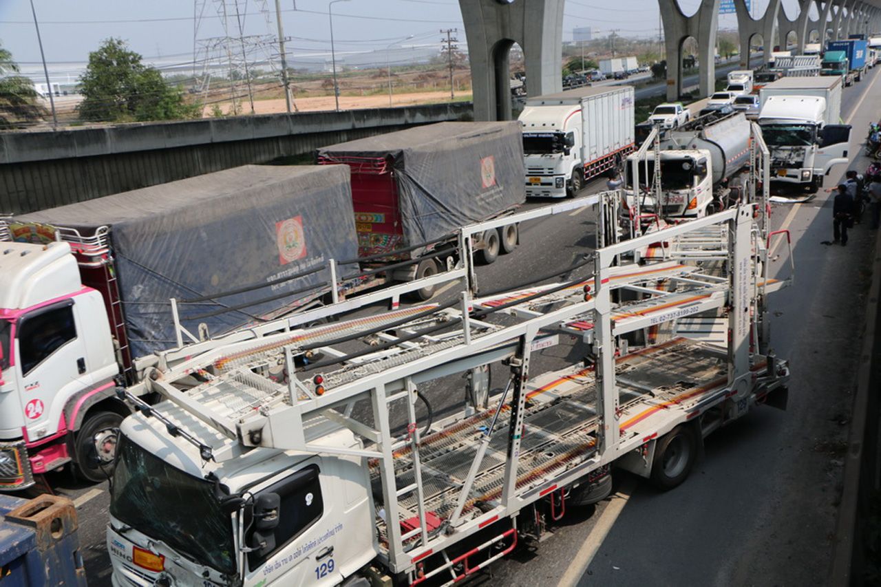 เกิดอุบัติเหตุบนถนนบางนา-ตราด ขาเข้าช่องทางด่วน รถบรรทุกชนกัน 4 คันรวด เหตุจากซ่อมถนน รถชะลอตัว แต่คนขับรถหกล้อไม่รู้ ห้อมาเต็มที่ พุ่งชนท้ายรถขนน้ำมัน ก่อนชนต่อกันมาเป็นทอดๆ ถึง 4 คัน ทำให้ต้องปิดถนนเพื่อเคลียร์รถนานกว่าชั่วโมง ...