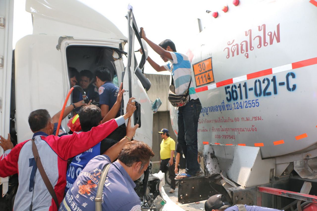 ที่เกิดเหตุพบรถบรรทุกหกล้อ ฮีโน่ สีขาว ทะเบียน 71-1173 นครปฐม ชนอัดติดท้ายรถสิบล้อบรรทุกน้ำมัน ฮีโน่ สีขาว ทะเบียน 71-4066 ชลบุรี ของนายสุกรี ทำยศ อายุ 52 ปี ทำให้ นายสุวพัชญ์ พูลสวัสดิ์ อายุ 27 ปี บ้านเลขที่ 44/1 ม.14 ต.โคกยาง อ.ปราสาท จ.สุรินทร์ คนขับรถบรรทุกหกล้อได้รับบาดเจ็บติดอยู่ในรถ หน่วยกู้ภัยฉะเชิงเทราต้องใช้อุปกรณ์ตัดถ่างช่วยเหลือใช้เวลาประมาณ 5 นาที จึงสามารถนำตัวออกมาได้และนำส่ง รพ.จุฬารัตน์ 11 ทันที