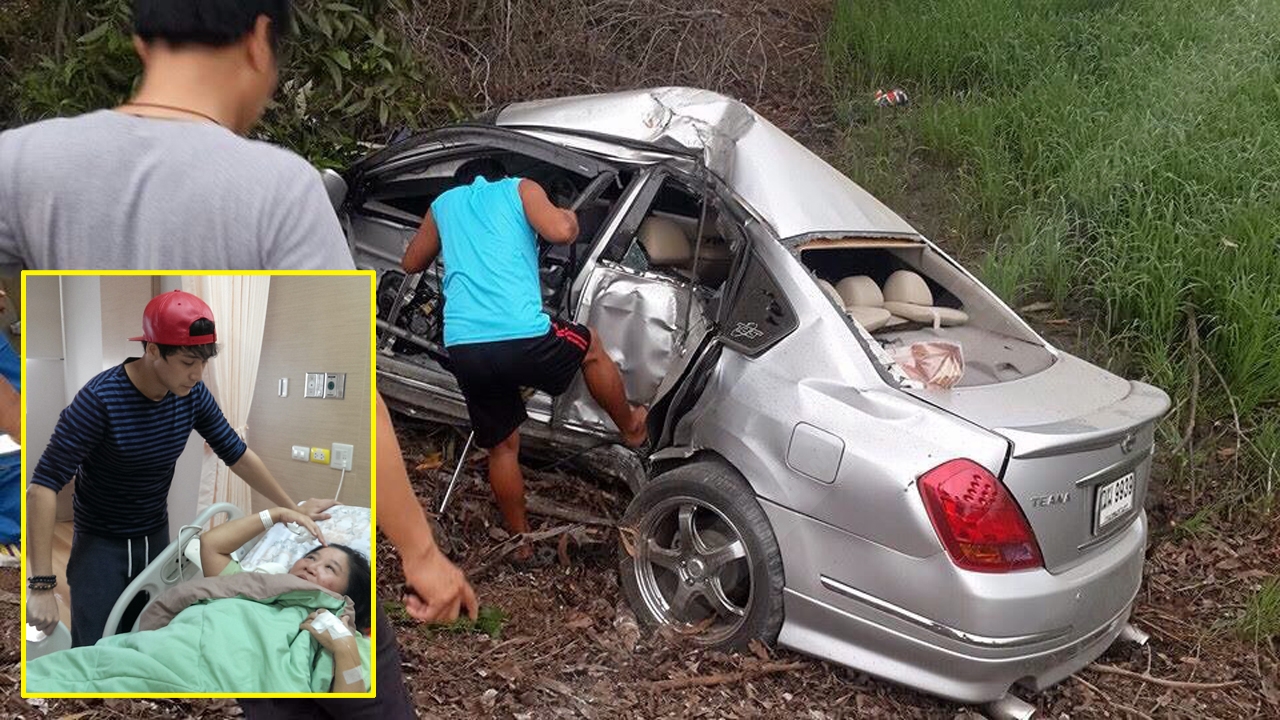 สภาพรถเก๋งนิสสัน เทียน่าที่ “แฟร์-กันต์ดนย์ อะคาซาน” พระเอกละครขับไปถ่ายละครแล้วมีสุนัขวิ่งตัดหน้าเสียหลักพุ่งชนต้นไม้ริมถนนสายบางเลน-บางหลวง อ.บางเลน จ.นครปฐม รถพังยับ ส่วนภาพเล็ก มารดาบาดเจ็บ.