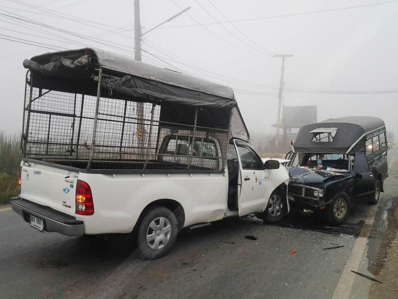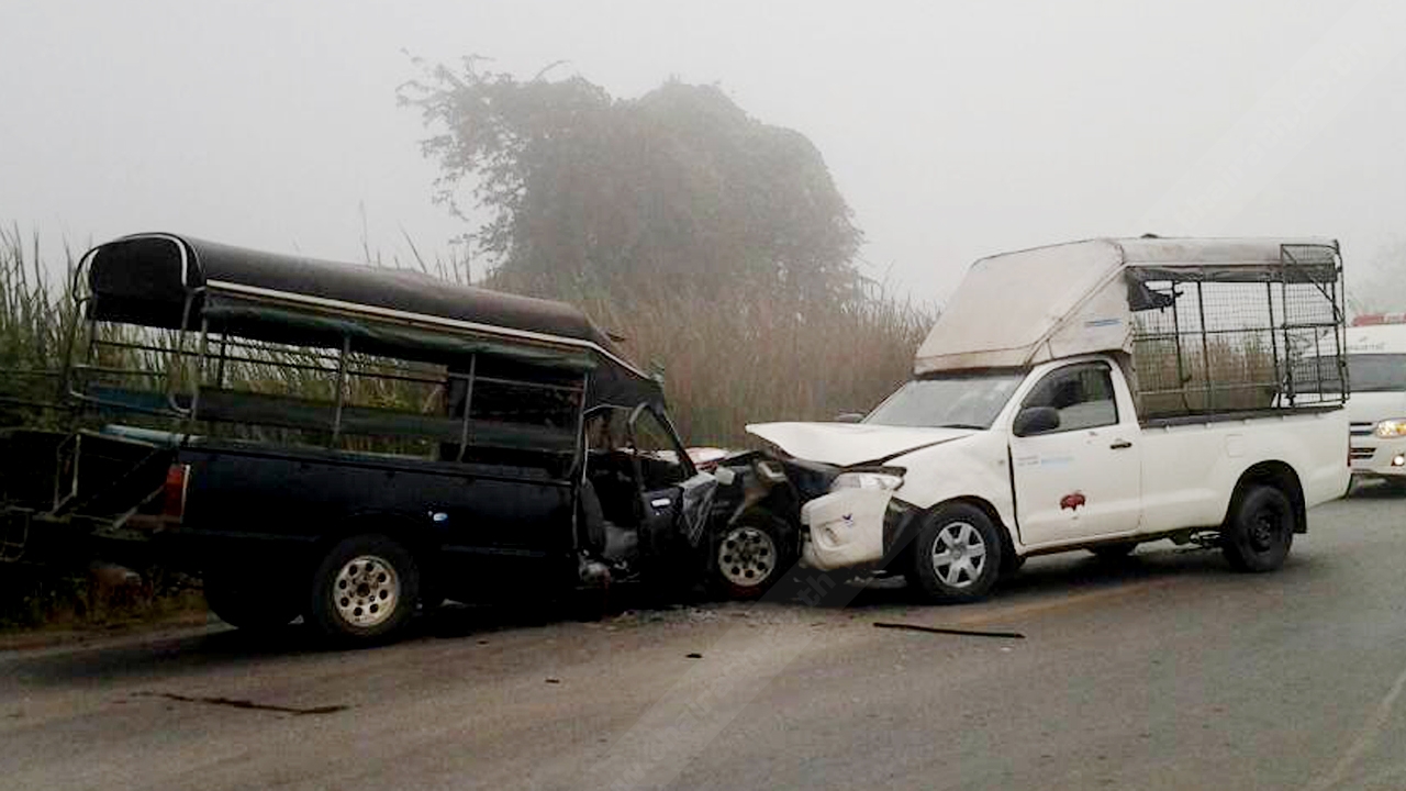 หมอกลงหนาบนถนนที่ปทุมธานี รถรับส่งนักเรียนวิ่งมาในเลนตัวเอง ถูกรถกระบะที่แซงขึ้นมาพุ่งชนประสานงา นักเรียนในรถร้องกันระงม มีผู้ได้รับบาดเจ็บ 17 คน คาดคนขับรถกระบะมองไม่เห็น เพราะบนถนนมีหมอกหนา ตร.แจ้งข้อหาขับรถโดยประมาทฯ...