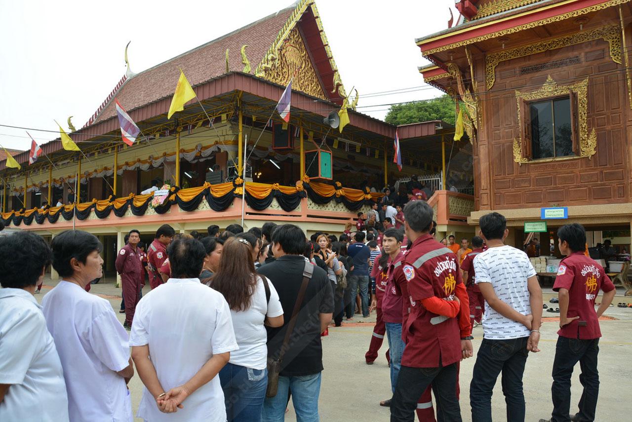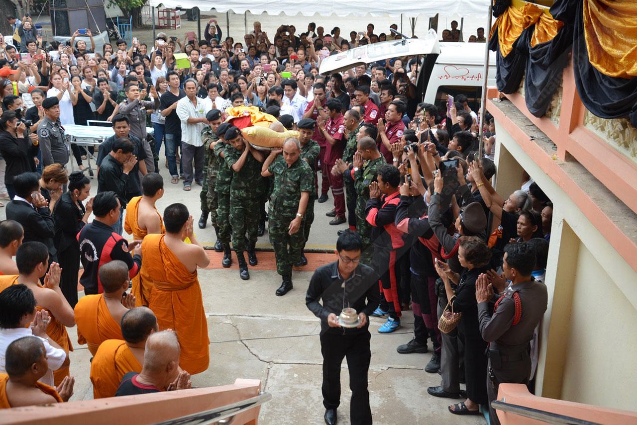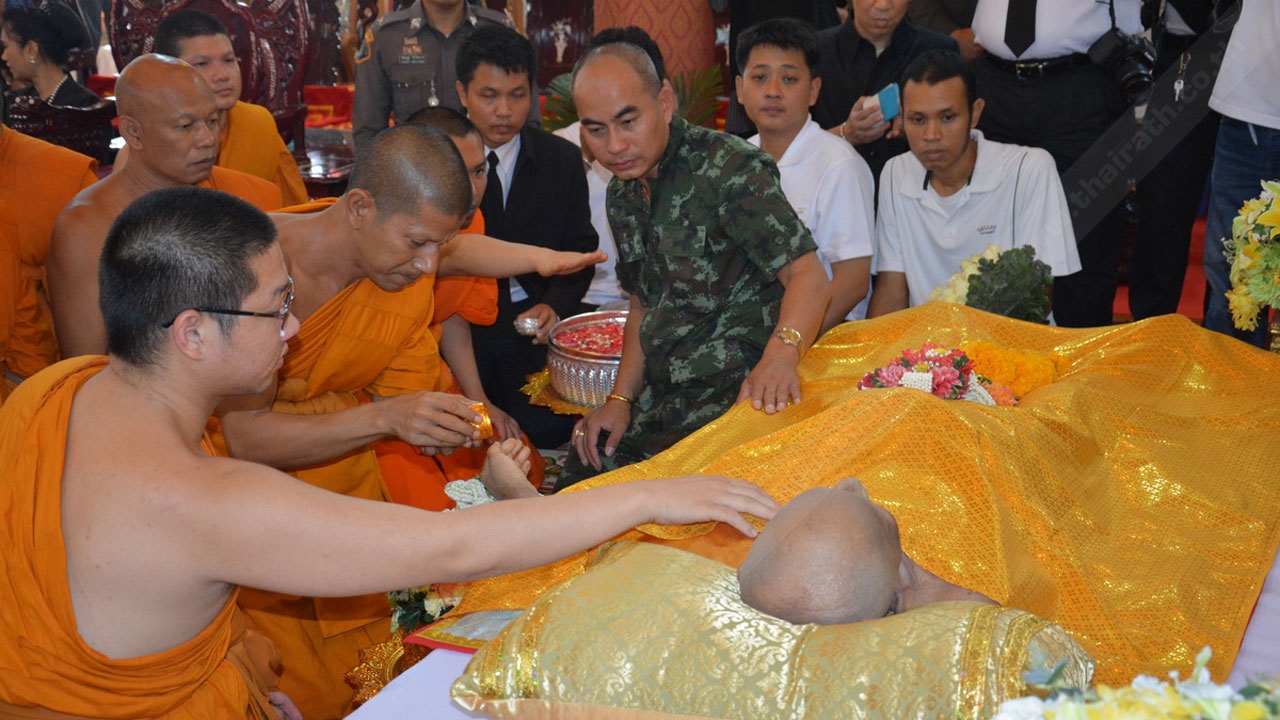จากนั้นเวลาต่อมา นายวรากร เจ้าหน้าที่ที่เกี่ยวข้อง และบรรดาศิษยานุศิษย์ ร่วมทำพิธีนำสังขารของหลวงพ่อเอียดขึ้นไว้บนศาลาการเปรียญ โดยมีพระภิกษุ สามเถร ได้ทำพิธีสวดและได้ให้ประชาชนลูกศิษย์รดน้ำศพ หลังจากนั้นในช่วงเวลา 17.00 น. พระเทพรัตนากร เจ้าอาวาสวัดพนัญเชิงวรวิหาร เจ้าคณะจังหวัดพระนครศรีอยุธยา จะเดินทางมาเป็นประธานในพิธีพระราชทานน้ำหลวงสรงศพ ที่ได้รับโปรดเกล้าฯ จากพระบาทสมเด็จพระเจ้าอยู่หัว ซึ่งจะมีการสวดพระอภิธรรมเป็นเวลา 100 วัน และจะเก็บสังขารของหลวงพ่อเอียดเอาไว้ให้ประชาชนกราบไหว้ต่อไป